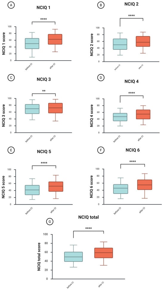 A Wilcoxon signed-rank test was conducted to compare the NCIQ scores before and one year after CI (Figure 3). The total median NCIQ score before CI was 50, and after CI, 59.4 (Figure 3G). The test indicated a significant difference between the groups (z = −7.39, p = 4.4508 × 10−15, r = −0.35—medium effect size), suggesting a significantly higher score after CI.