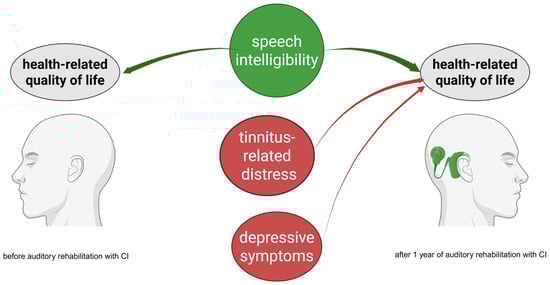 Background/Objectives: The purpose of this study was to analyze changes in speech intelligibility, health-related quality of life, and the degree of comorbidities (depressive and anxiety symptoms and tinnitus-related distress) in a large cohort of 227 adults who underwent auditory rehabilitation with a cochlear implant (CI). The second goal was to identify the factors that influence the health-related quality of life in this cohort. Methods: Pre- and one-year post-CI data were collected on speech intelligibility (Freiburg Monosyllabic Test, FS), subjective hearing ability (Oldenburg Inventory, OI), health-related quality of life (Nijmegen Cochlear Implant Questionnaire, NCIQ), depressive symptoms (General Depression Scale, ADS-L), anxiety (Generalized Anxiety Disorder 7, GAD-7), perceived stress (Perceived Stress Questionnaire, PSQ), and tinnitus-related distress (Tinnitus Questionnaire, TQ). Results: The Wilcoxon matched-pairs signed-rank test showed significant improvements across the entire cohort in speech intelligibility, subjective hearing, and the quality of life. The scores indicating anxiety, depressiveness, perceived stress, and tinnitus-related distress decreased. The Spearman correlation showed that before implantation, quality of life positively related to subjective hearing, while depression, anxiety, stress, and tinnitus distress were negatively correlated. After a year, these links persisted but grew stronger. Regression analyses found subjective hearing (OI) as a positive predictor, and depression (ADS-L) and tinnitus distress (TQ) as negative predictors of life quality, especially in patients with low or median NCIQ scores. Conclusions: In a substantial cohort of adult patients with diverse CI indications, auditory rehabilitation enhances speech intelligibility and subjective hearing, improves health-related quality of life, and reduces the severity of depressive and anxiety symptoms, as well as tinnitus-related distress. Subjective hearing contributes positively to quality of life, whereas depressive symptoms and tinnitus distress negatively impact quality of life in patients with low NCIQ scores post-CI, highlighting the importance of monitoring and psychological intervention.