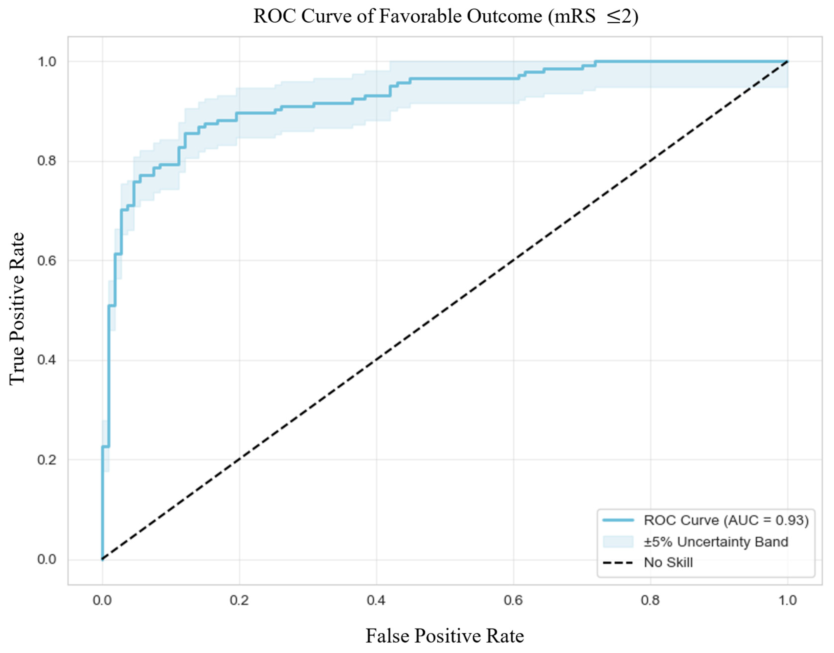 In terms of predictive performance (Figure 1), the model showed excellent discrimination with an area under the curve (AUC) of 0.93, an accuracy of 86.5%, sensitivity of 85.5%, and specificity of 87.9%. Precision was high at 90.5%, with an F1 score of 87.9%, indicating strong reliability in identifying patients at risk of poor functional recovery. Calibration was also good, reflected by a Brier Score of 0.1055. The optimal classification threshold, determined via Youden’s Index, was 0.50.
