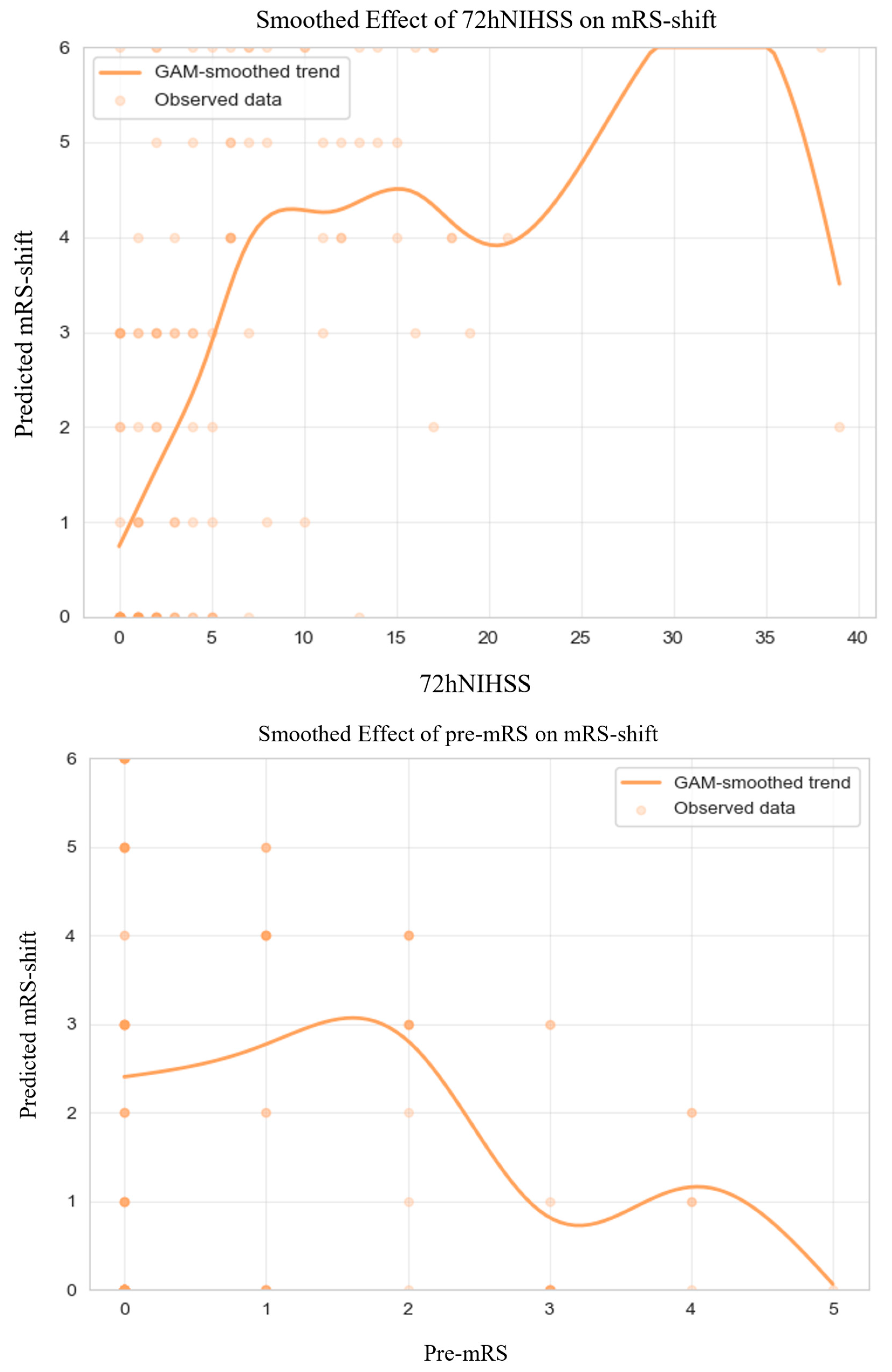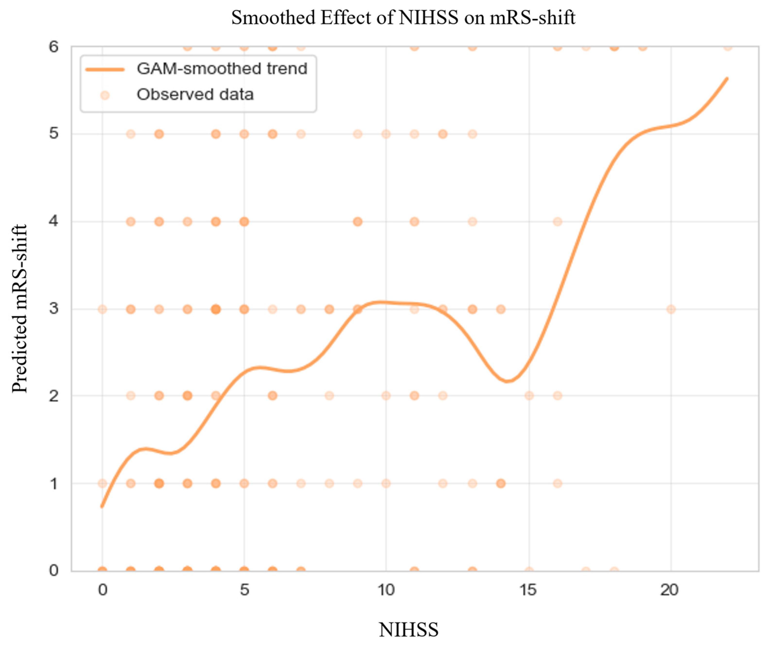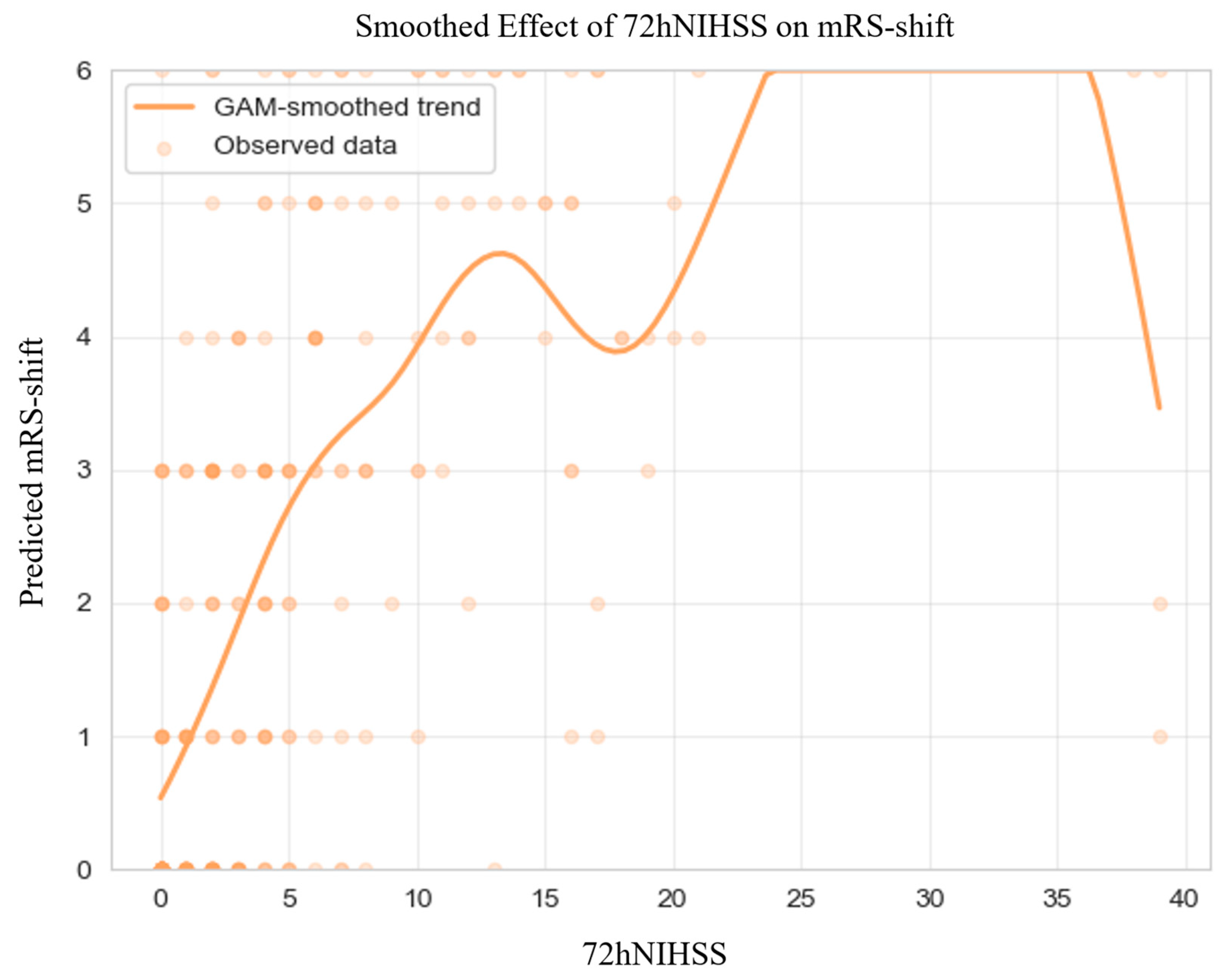 GAM-derived plots (Figure 2) highlighted non-linear associations between continuous predictors and mRS-shifts. Elevated NIHSS scores at admission and at 72 h consistently predicted greater mRS-shift.