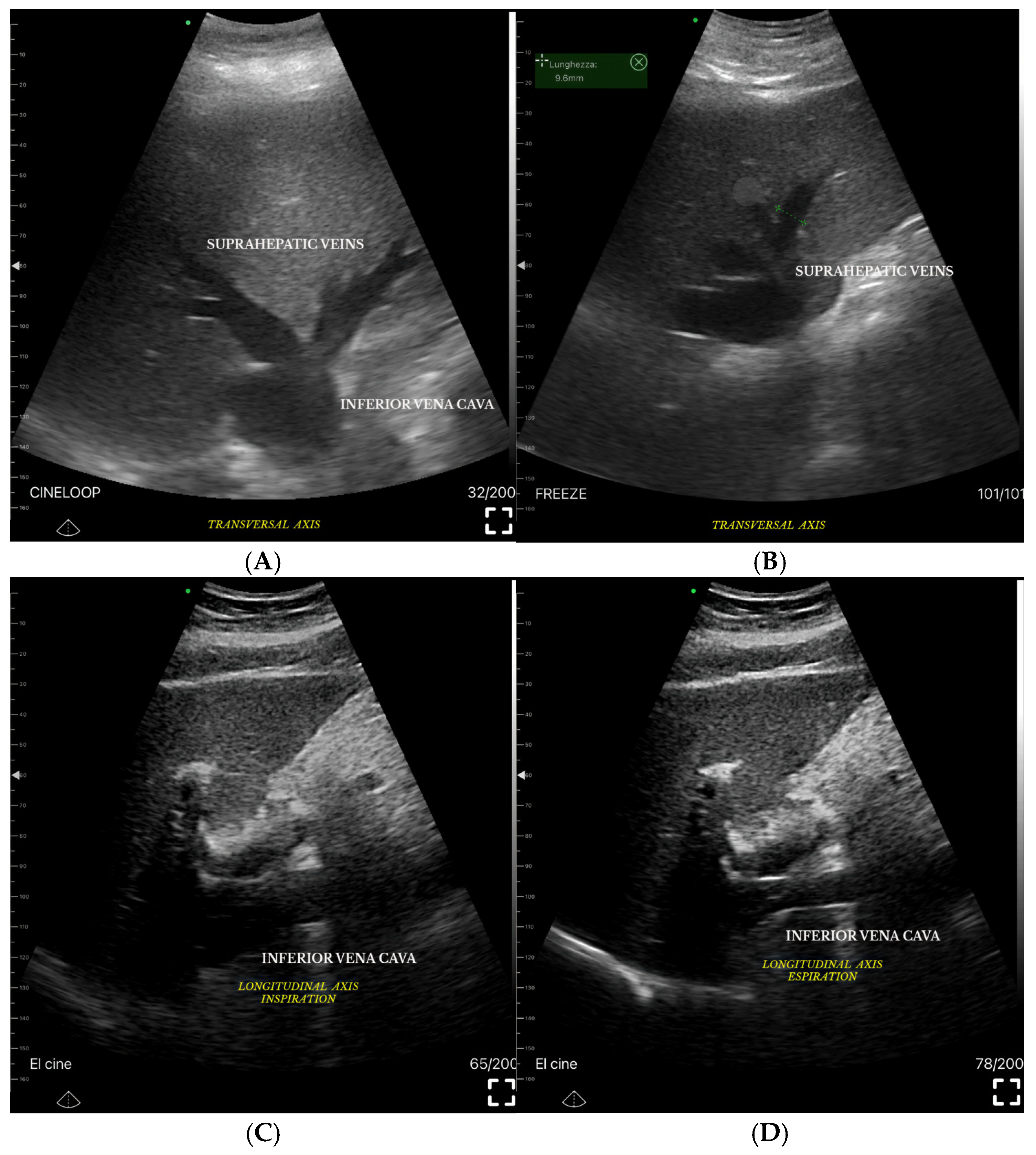 - B-Mode Parameters: Bowel wall thickness, inferior vena cava (IVC) diameter and collapsibility, hepatic vein dilation.