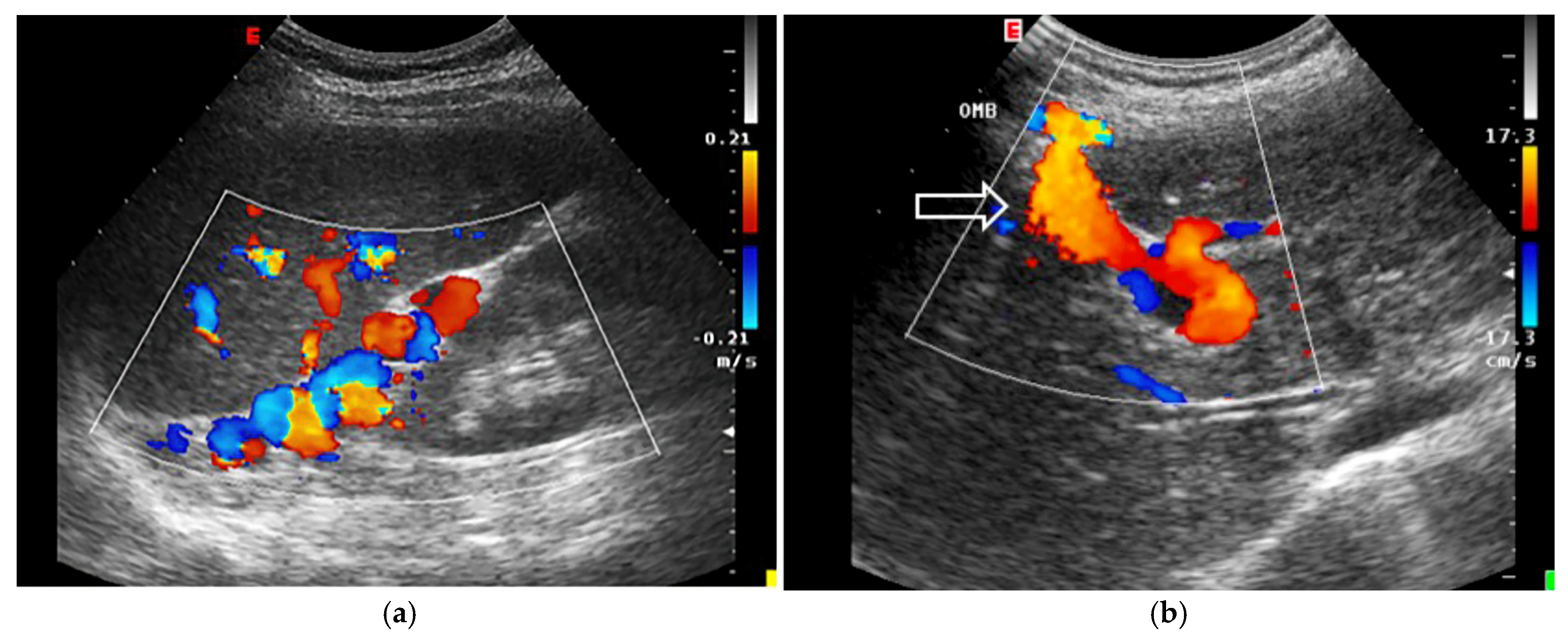 - Intra-Renal Vein Doppler: Similar to the portal vein, intra-renal veins show continuous flow under normal conditions, but congestion leads to a pulsatile pattern. This can manifest as a biphasic pattern in moderate congestion and a monophasic pattern in severe cases [114]. Altered intra-renal flow is associated with poor outcomes in heart failure and pulmonary hypertension patients [56,114].