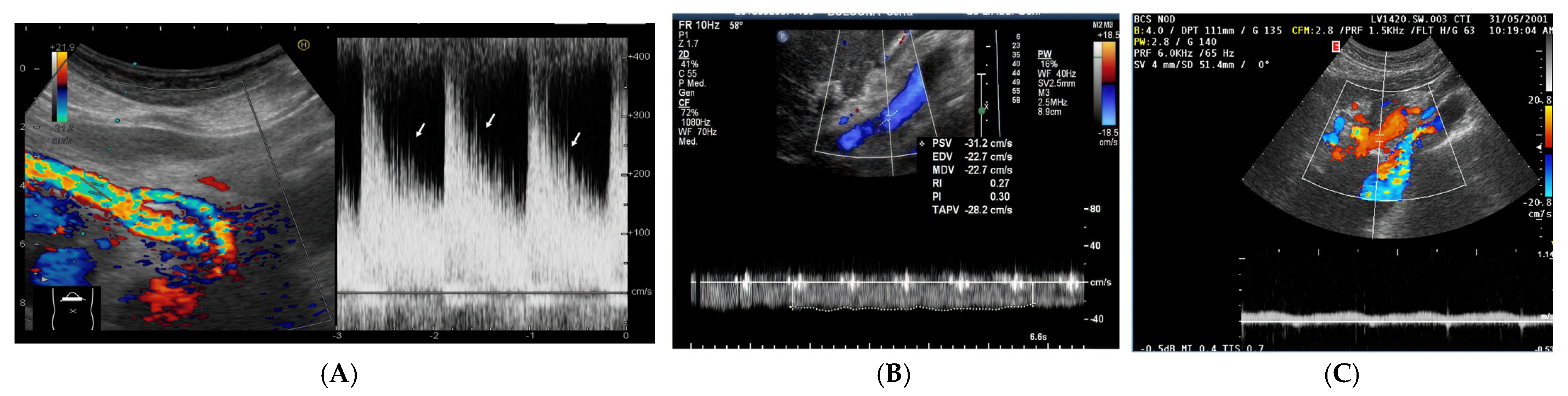 - Hepatofugal (Retrograde) Flow: Hepatofugal flow happens when the pressure in the portal vein exceeds that of the liver, causing flow to reverse and appear below the baseline. This is another indicator of portal hypertension, which can be caused by various conditions, including cirrhosis, right-sided heart failure and other portal vein obstructions [107] (Figure 9).Figure 9. (A) Increased pulsatility due to arteriovenous shunting in a case of hereditary haemorrhagic telangiectasia; (B) Reduced Portal Flow in a case of cirrhosis (C) Hepatofugal Flow of Portal Vein is a late sign of Portal Hypertension. It happens when the pressure in the portal vein exceeds that of the liver, causing flow to reverse and appear below the baseline. This is another indicator of portal hypertension, which can be caused by various conditions, including cirrhosis, right-sided heart failure and other portal vein obstructions.Figure 9. (A) Increased pulsatility due to arteriovenous shunting in a case of hereditary haemorrhagic telangiectasia; (B) Reduced Portal Flow in a case of cirrhosis (C) Hepatofugal Flow of Portal Vein is a late sign of Portal Hypertension. It happens when the pressure in the portal vein exceeds that of the liver, causing flow to reverse and appear below the baseline. This is another indicator of portal hypertension, which can be caused by various conditions, including cirrhosis, right-sided heart failure and other portal vein obstructions.