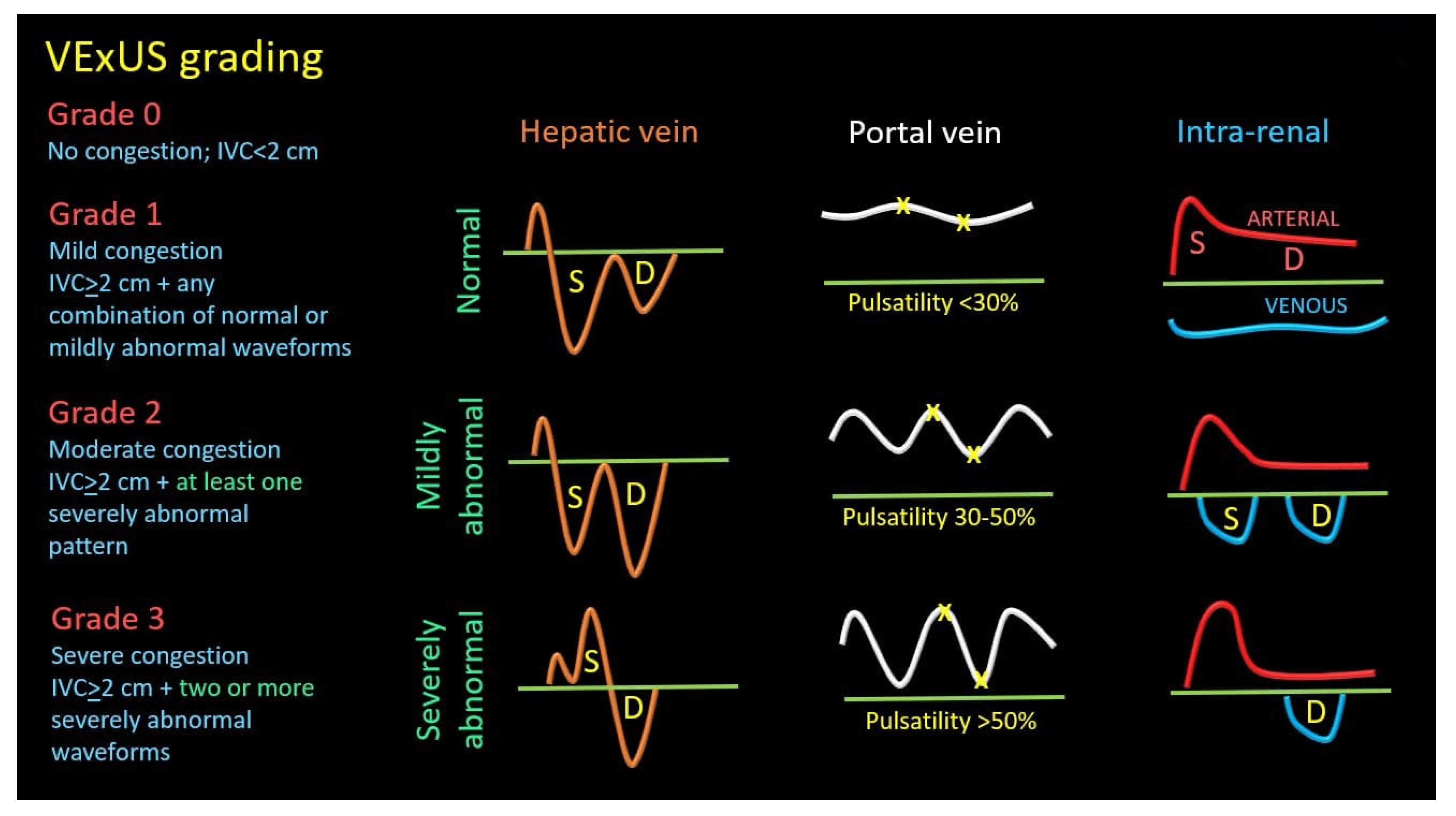 - Grading Venous Congestion: Venous congestion is categorized into grades 0–3 based on waveform alterations, a system known as VExUS (Venous Excess Ultrasound Score) (Figure 14) [63]. This grading system provides a practical method for assessing the severity of venous congestion in clinical settings (Figure 15).