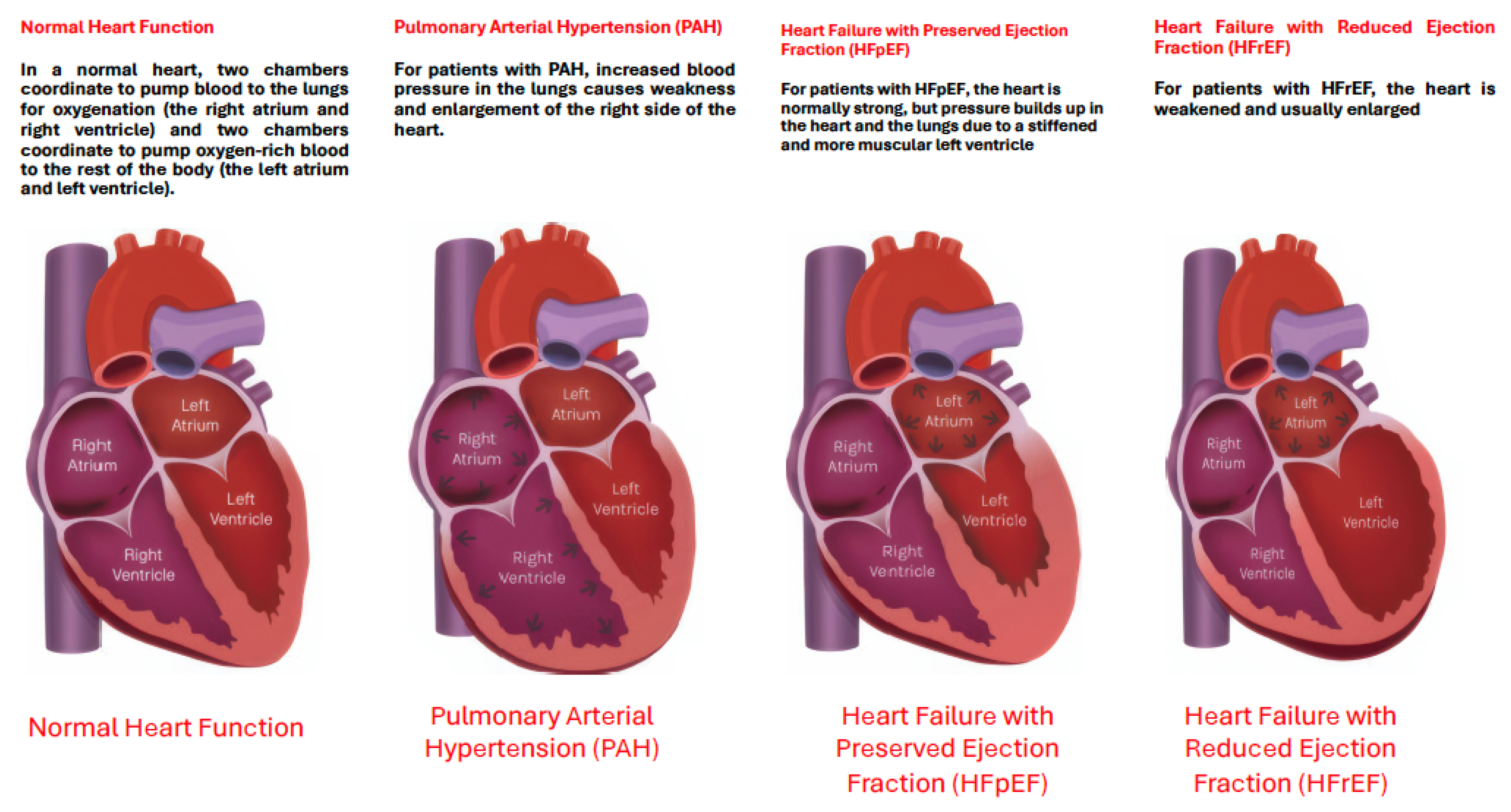| Primary dysfunction | Diastolic impairment (impaired relaxation, stiff ventricle) | Systolic impairment (reduced contractility, LVEF ≤ 40%) | Increased RV afterload due to elevated pulmonary vascular resistance |