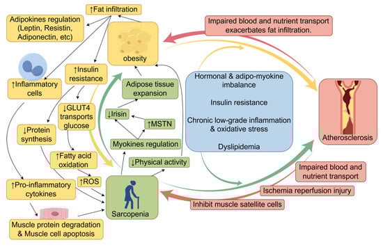 The relationship between SO and atherosclerosis has recently attracted interest. Nonetheless, because of research limitations—such as uneven diagnostic criteria, heterogeneous study populations, comorbidities, and sex disparities—the association between SO and atherosclerosis remains contentious. The causal relationship remains unestablished, and the underlying pathophysiological mechanisms of this correlation are uncertain. While the current understanding of obesity and atherosclerosis may partially elucidate the relationship between SO and atherosclerosis, SO cannot be seen as a straightforward aggregation of sarcopenia and obesity. The “obesity paradox” has led academics to discuss the importance of muscle-fat interactions. Recent studies have indicated that SO may facilitate the initiation and progression of atherosclerosis via various mechanisms, including hormonal abnormalities, insulin resistance (IR), chronic low-grade inflammation, and dyslipidemia [,,,,]. A complex vicious cycle may exist among muscle loss, fat accumulation, and atherosclerosis—a link not yet thoroughly investigated in prior research. Clarifying the relationship and mechanisms between SO and atherosclerosis is crucial for the early prevention and treatment of ASCVD. This review intends to encapsulate recent developments in SO diagnostic criteria, consolidate research on their correlations, and investigate probable mechanisms—specifically, the detrimental cycle involving muscle atrophy, adipose tissue deposition, and atherosclerosis. This review establishes a theoretical framework for enhancing future research and delineates prospective directions for investigation.