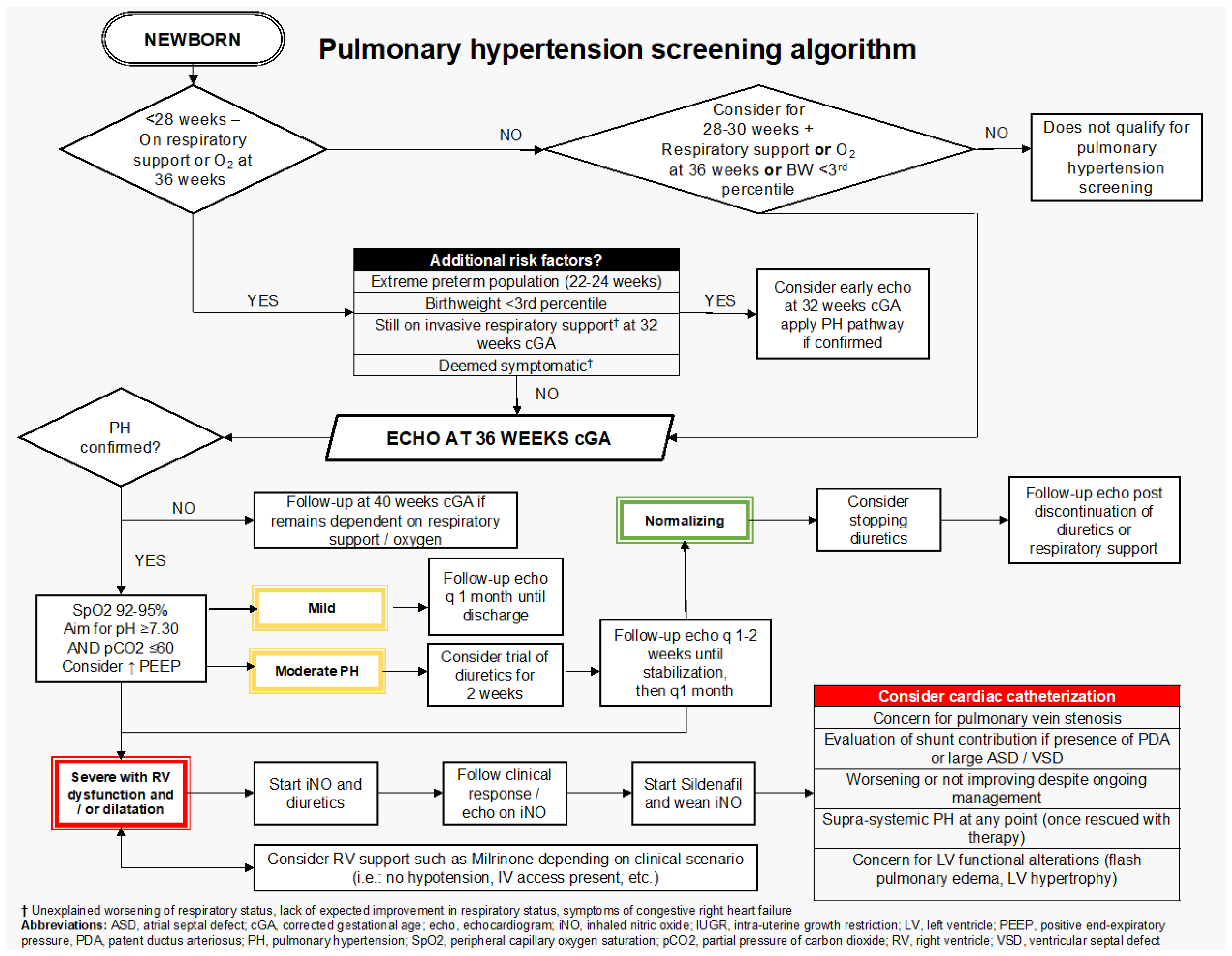 | Cardiac Catheterization | Indicated for suspected pulmonary vein stenosis, significant shunting, or lack of improvement; Consider if supra-systemic PH or LV dysfunction present; Cardiac anesthesia is recommended for procedural support. |