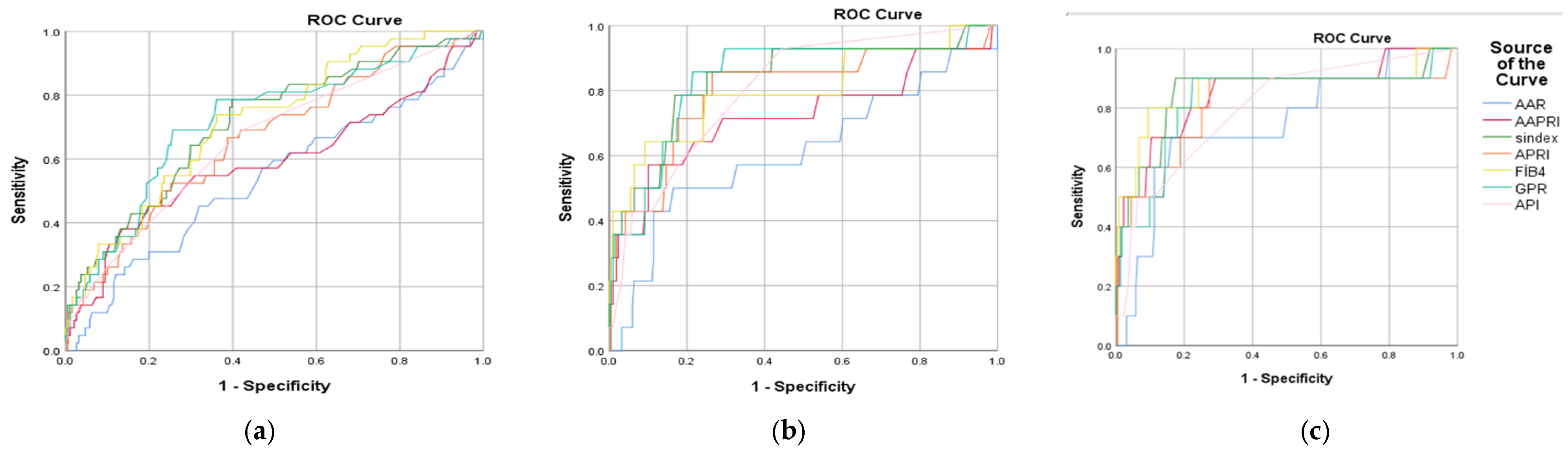 - Ozdemir, Y.E.; Ozdemir, M.S.; Bayramlar, O.F.; Kaya, S.Y.; Karaali, R.; Balkan, I.I.; Mete, B.; Aygun, G.; Saltoglu, N.; Tabak, F. Performance of noninvasive fibrosis indices in chronic hepatitis B during pretreatment and post-treatment periods. Biomark. Med. 2023, 17, 799–809. [Google Scholar] [CrossRef] [PubMed]
