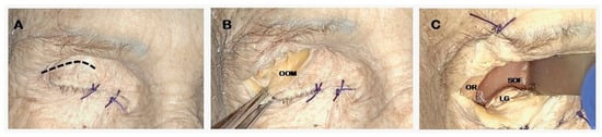 - Skin incision along the superior eyelid crease (Figure 1A).