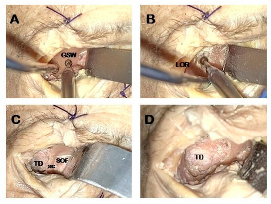 - Temporal fossa access: proximal portion of the lateral orbital wall of the greater sphenoid wing (GSW) is drilled acceding to the temporal fossa (Figure 2A).