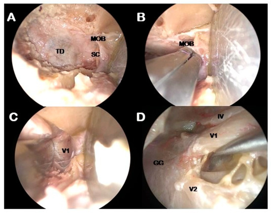 - Jeon, C.; Hong, C.-K.; Woo, K.I.; Hong, S.D.; Nam, D.-H.; Lee, J.-I.; Choi, J.W.; Seol, H.J.; Kong, D.-S. Endoscopic Transorbital Surgery for Meckel’s Cave and Middle Cranial Fossa Tumors: Surgical Technique and Early Results. J. Neurosurg. 2018, 131, 1126–1135. [Google Scholar] [CrossRef]