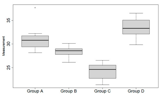 Boxplots correspond to time duration for each procedure/group. Each box is constituted by a horizontal wide black line, i.e., the median, and lower and upper horizontal thin lines, i.e., the first and third quartiles, respectively. The vertical lines, called “whiskers”, connect the box to the lowest and highest values within 1.5 times the interquartile range (i.e., the difference between third and first quartile). The single dot depicted at the top of group A boxplot is an outlier, because it falls outside the whiskers range.