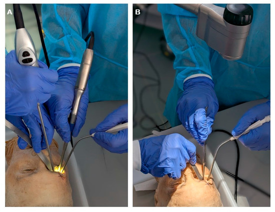 The dissections utilized a 3D exoscope (VITOM 3D, Karl Storz SE & Co. KG, Tuttlingen, Germany), consisting of a high-definition camera mounted on a static holder arm. The video signal was processed through the Telepack+ system (Karl Storz SE & Co. KG, Tuttlingen, Germany). Illumination of the surgical field was provided via fiber optics connected to the exoscope’s camera and powered by a Power LED 300 light source (Karl Storz SE & Co. KG, Tuttlingen, Germany).