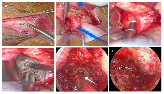 - Interdural dissection of the CS: peeling the outer layer of dura propria from the inner dural layer constituted by the epineurium of the third, fourth and ophthalmic cranial nerves exposes the lateral wall of the CS up to the lateral wall of the Meckel’s cave [23] (Figure 3D).
