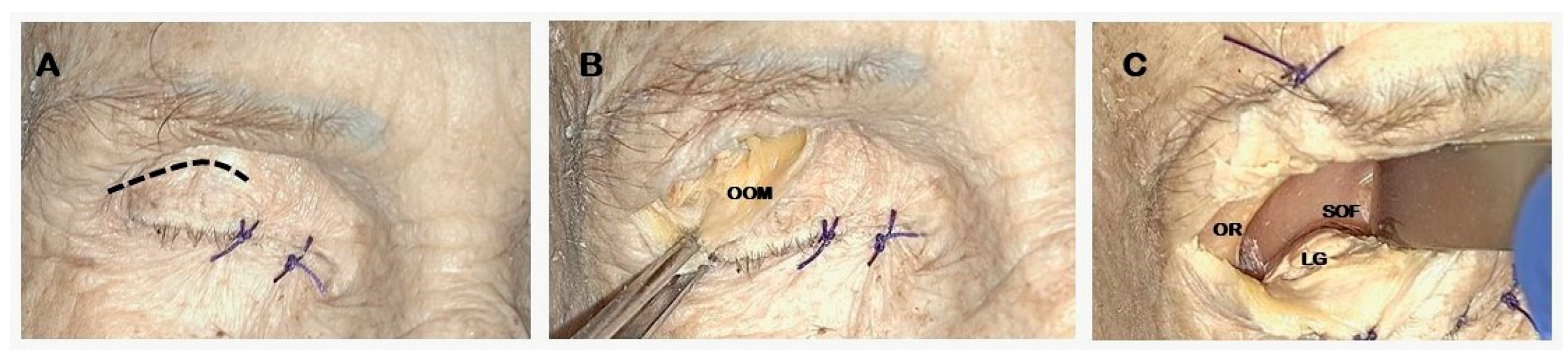 - Subcutaneous dissection of the orbicularis oculi muscle (OOM) to expose the orbital septum underneath (Figure 1B).