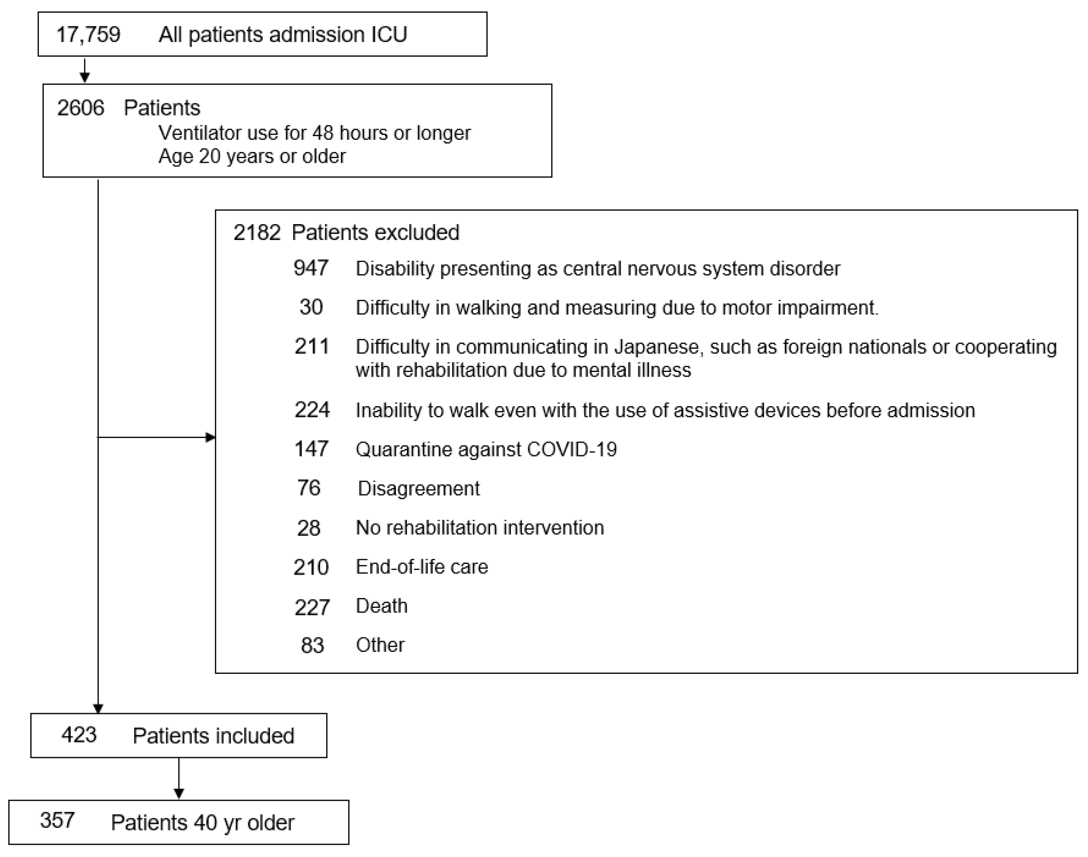 Of 17,759 ICU admissions, 2606 patients aged ≥ 20 years who received mechanical ventilation for ≥48 h were screened. After excluding 2182 patients due to clinical or functional limitations, 423 were eligible. Among them, 66 patients aged < 40 years were excluded, leaving 357 patients in the final analysis (