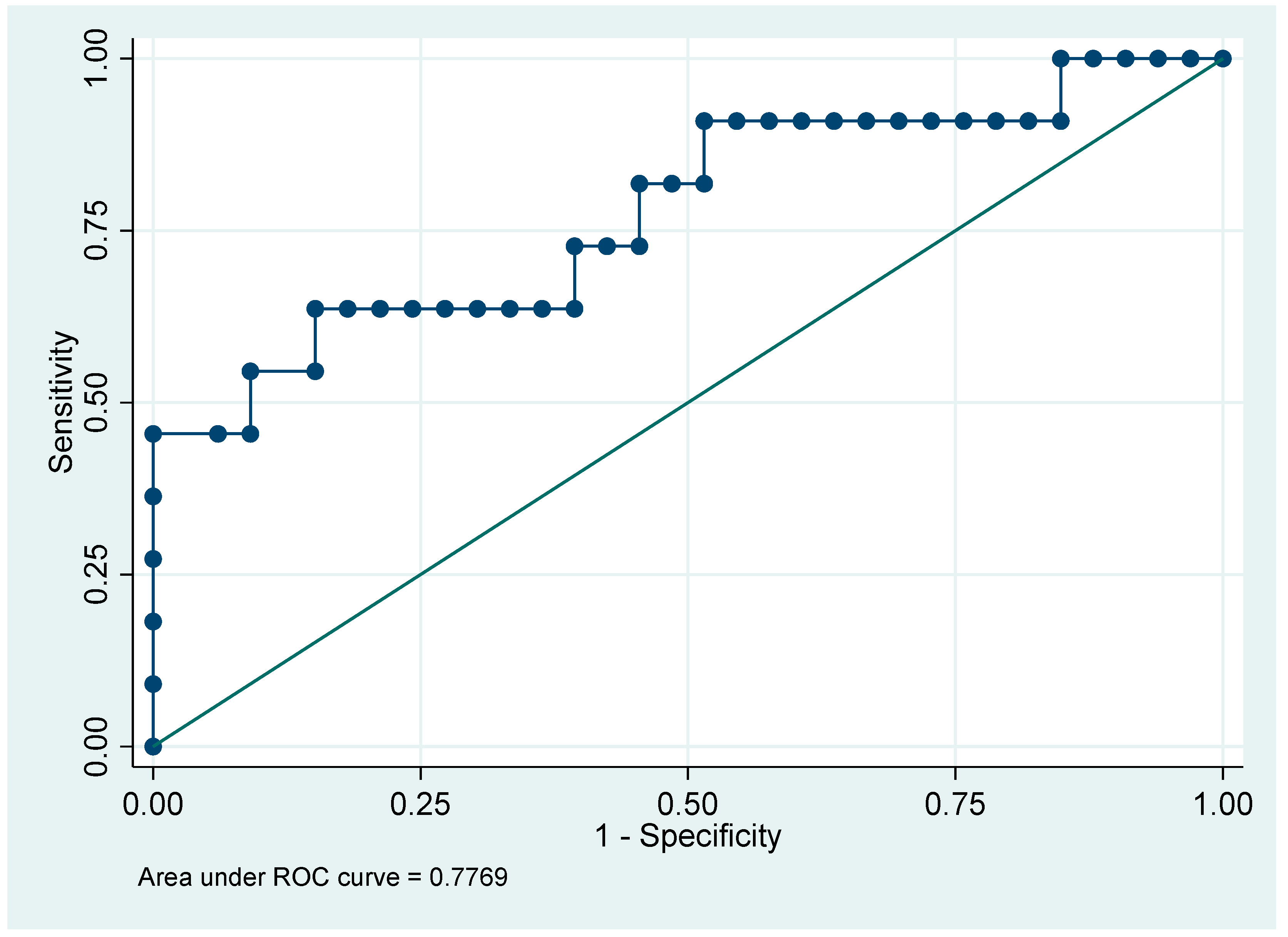 The only significant difference observed was in survival, where patients with ferropenia ≥ 300 (maximum value) had a higher proportion of non-survivors. No statistically significant differences were found in the other clinical variables. Regarding the ROC curve, the evaluated model has an AUC of 0.7769, indicating that it can correctly discriminate between positive and negative classes in approximately 78% of cases, which is considered good performance (
