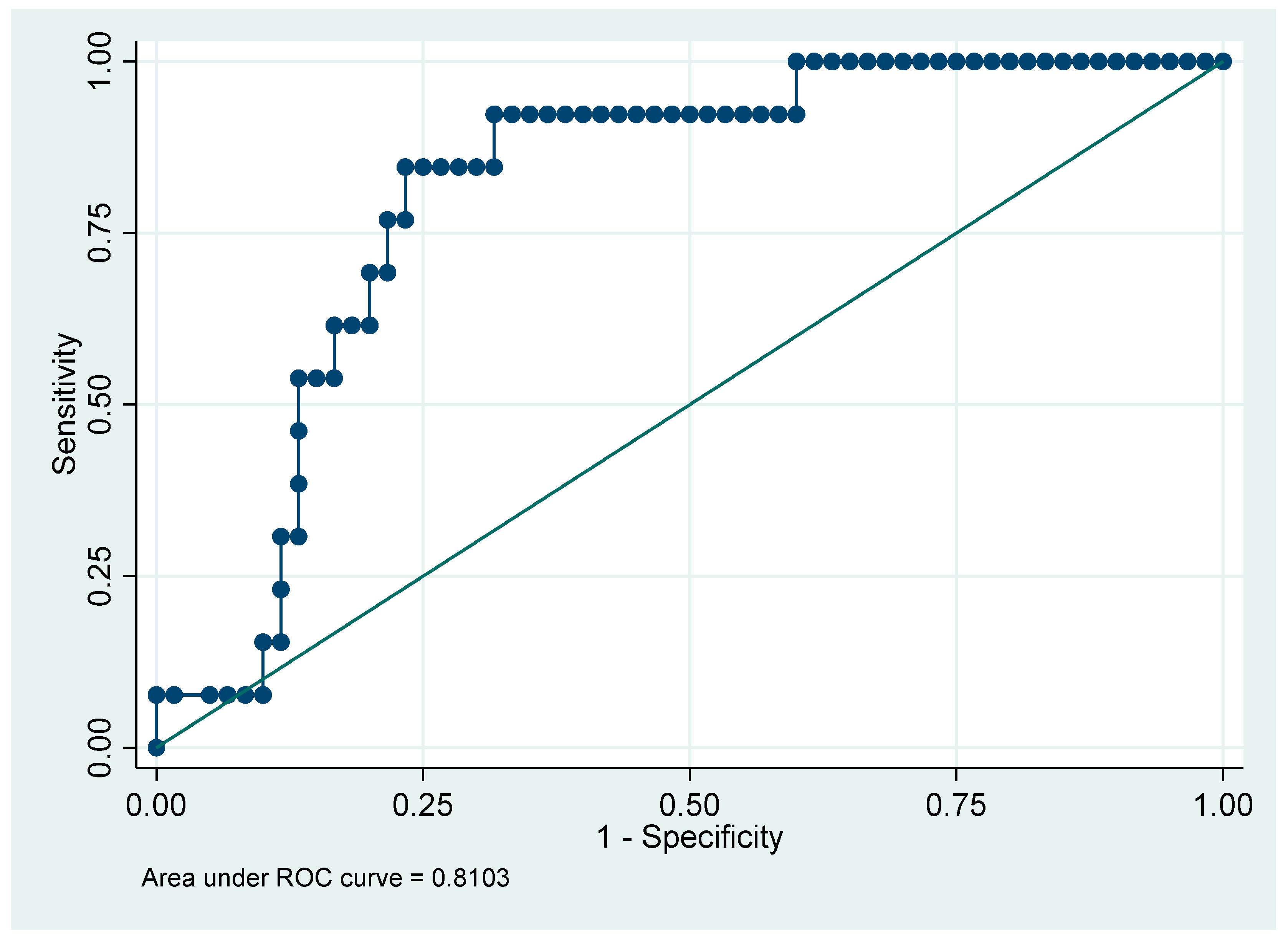 15], who identified a CRP cutoff of >5 mg/dL with moderate predictive capacity for mortality (AUC = 0.7). However, our study used a higher CRP cutoff (≥145 mg/L), which demonstrated better overall discriminative capacity (AUC = 0.8103), with high sensitivity (84.62%) and specificity (81.67%) for predicting adverse outcomes. Both studies conclude that elevated CRP levels are associated with worse clinical outcomes, and our data highlight an optimal cutoff (≥145 mg/L) with high sensitivity and specificity.