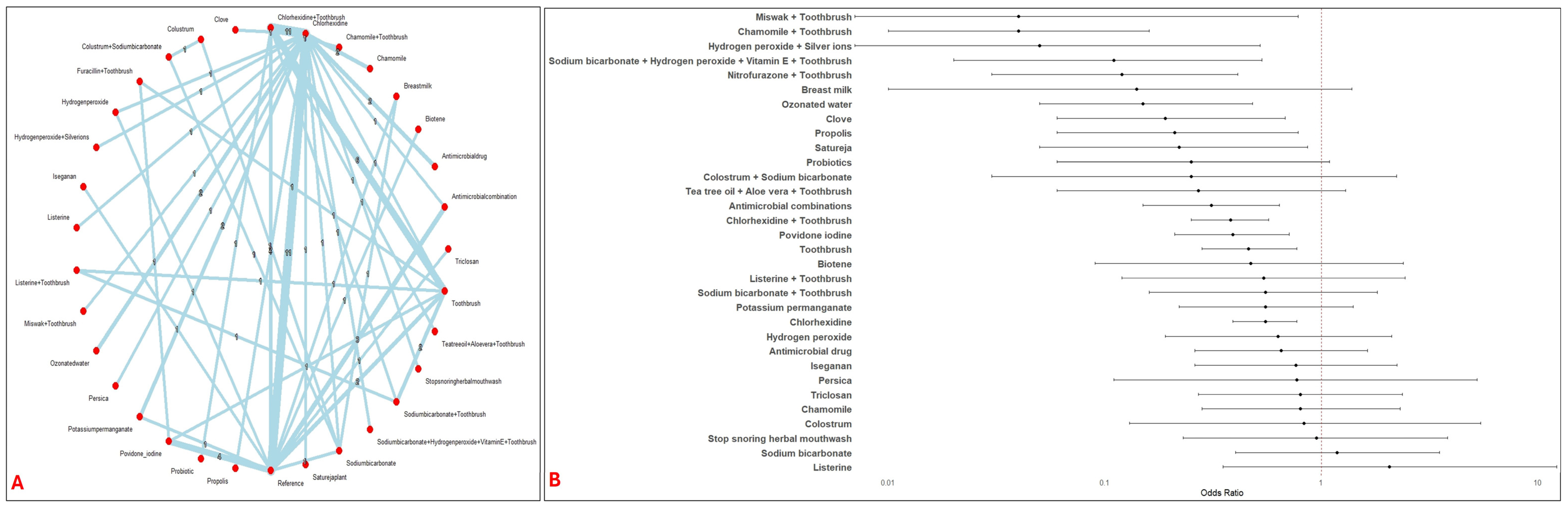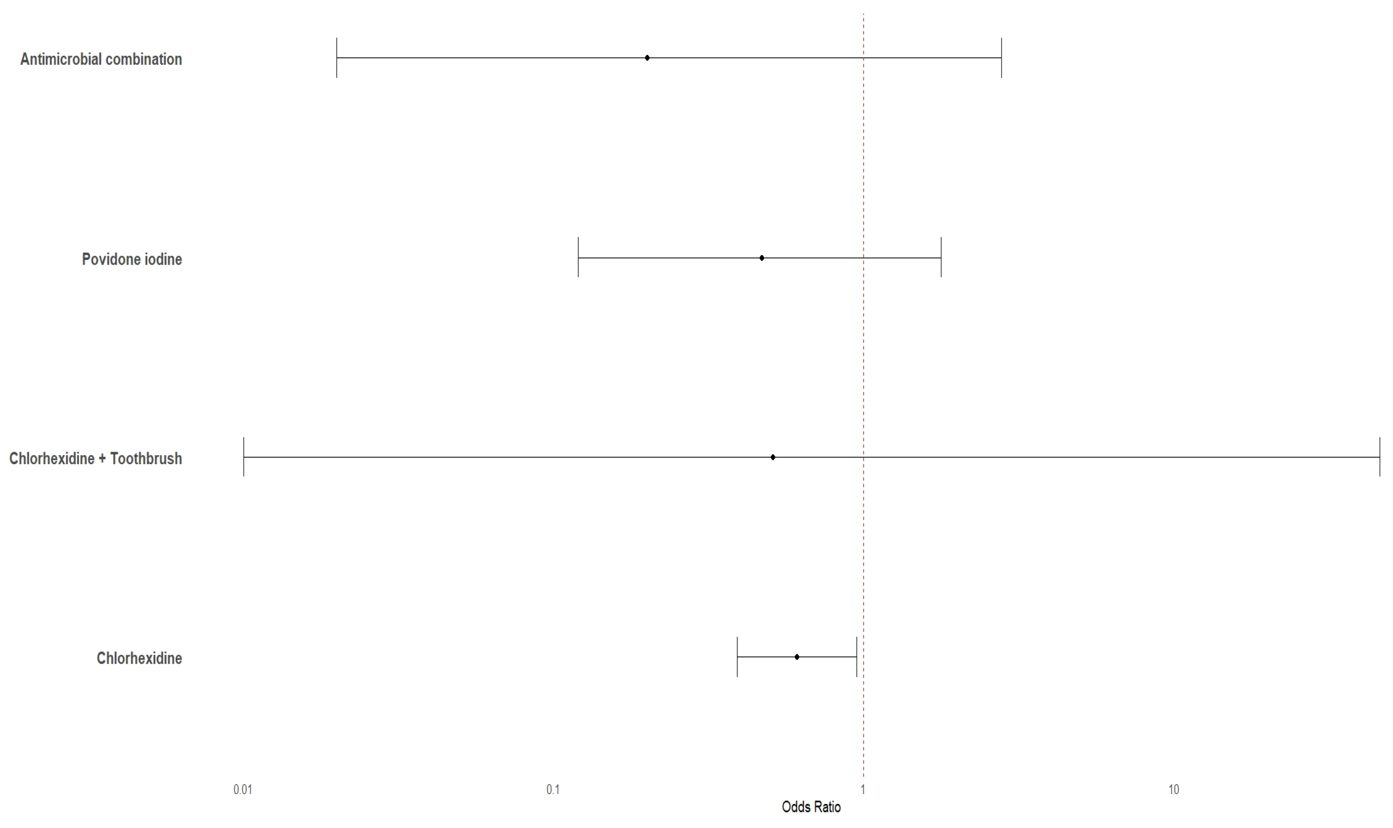 | Hyrogen peroxide+ Vitamin E + Toothbrush | 47 (9 to 193) | 0.11 [0.02, 0.53]; Very low 2,3 | |