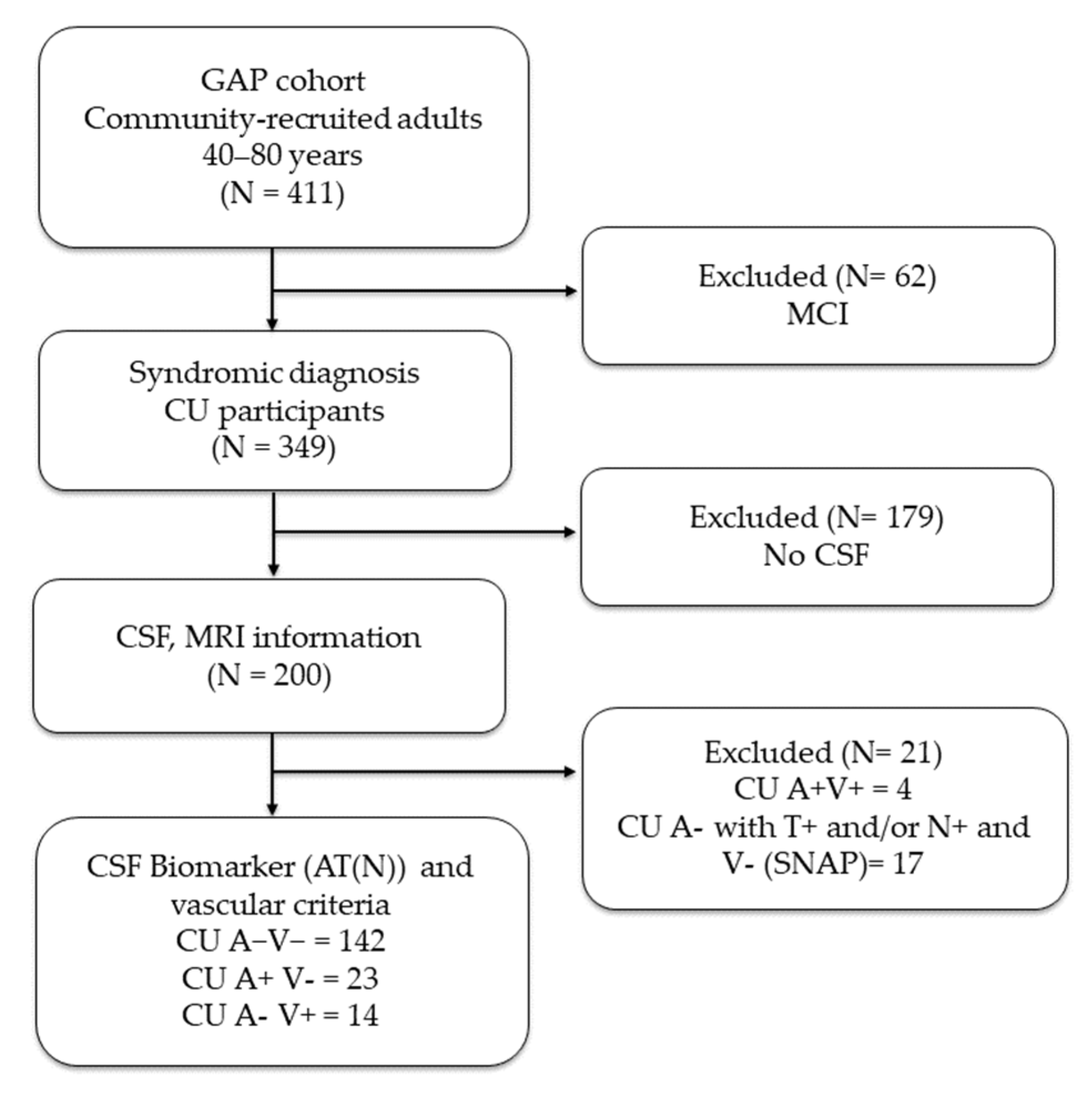 Figure 1. Participant Flow Diagram CAD Study. Abbreviations: MCI = Mild Cognitive Impairment; CU = Cognitively Unimpaired; CSF = Cerebrospinal fluid; GAP = Gipuzkoa Alzheimer Project; A = Amyloid pathology; V = Vascular pathology.