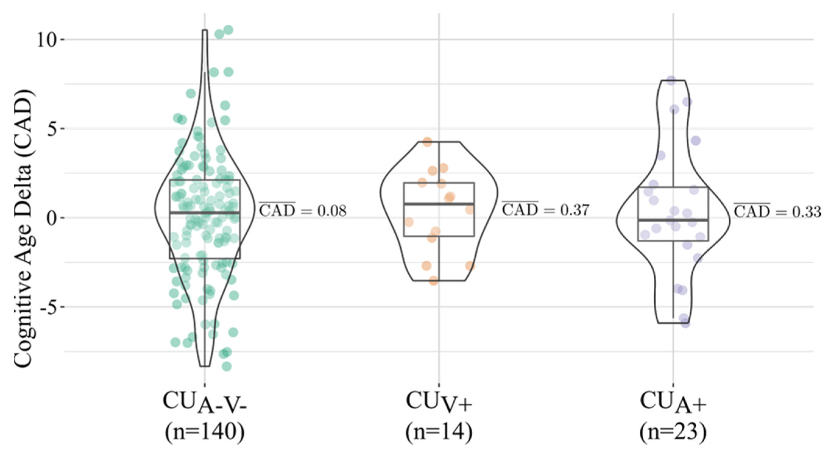 Figure 3. Comparison of Cognitive Age Delta (CAD) values among CU subgroups (CUA−V−, CUA+, and CUV+).