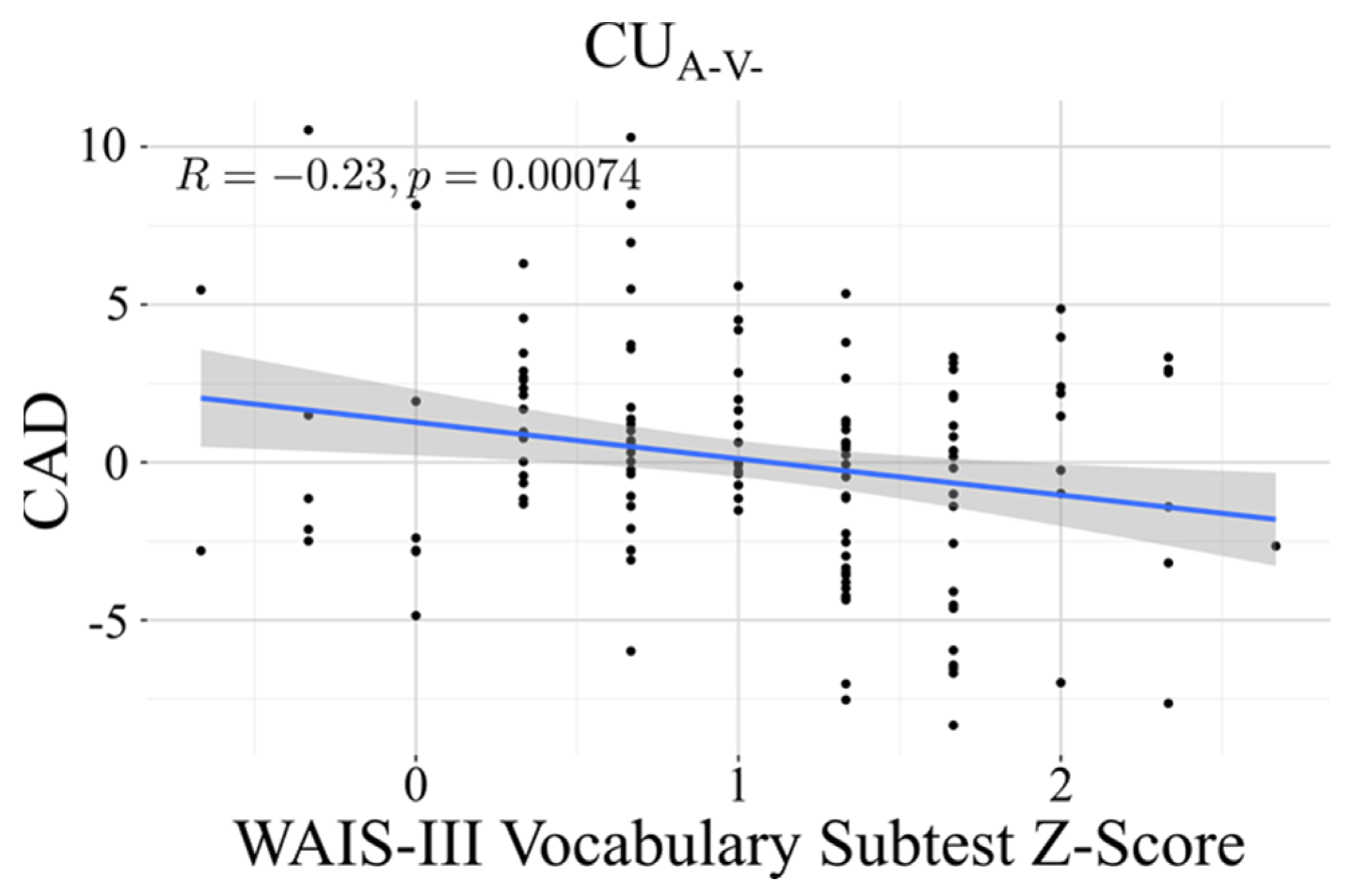 Figure 4. Association between Cognitive Age Delta (CAD) and WAIS-III Vocabulary z-scores in the CUA−V− group. The scatterplot shows the linear relationship between CAD and Vocabulary performance in the biomarker-negative clinical group, after correcting for years of education, sex, and APOE ε4 load. The fitted regression line (solid) and the 95% confidence interval (shaded area) are displayed. Higher Vocabulary scores were associated with a lower (younger) predicted cognitive age.