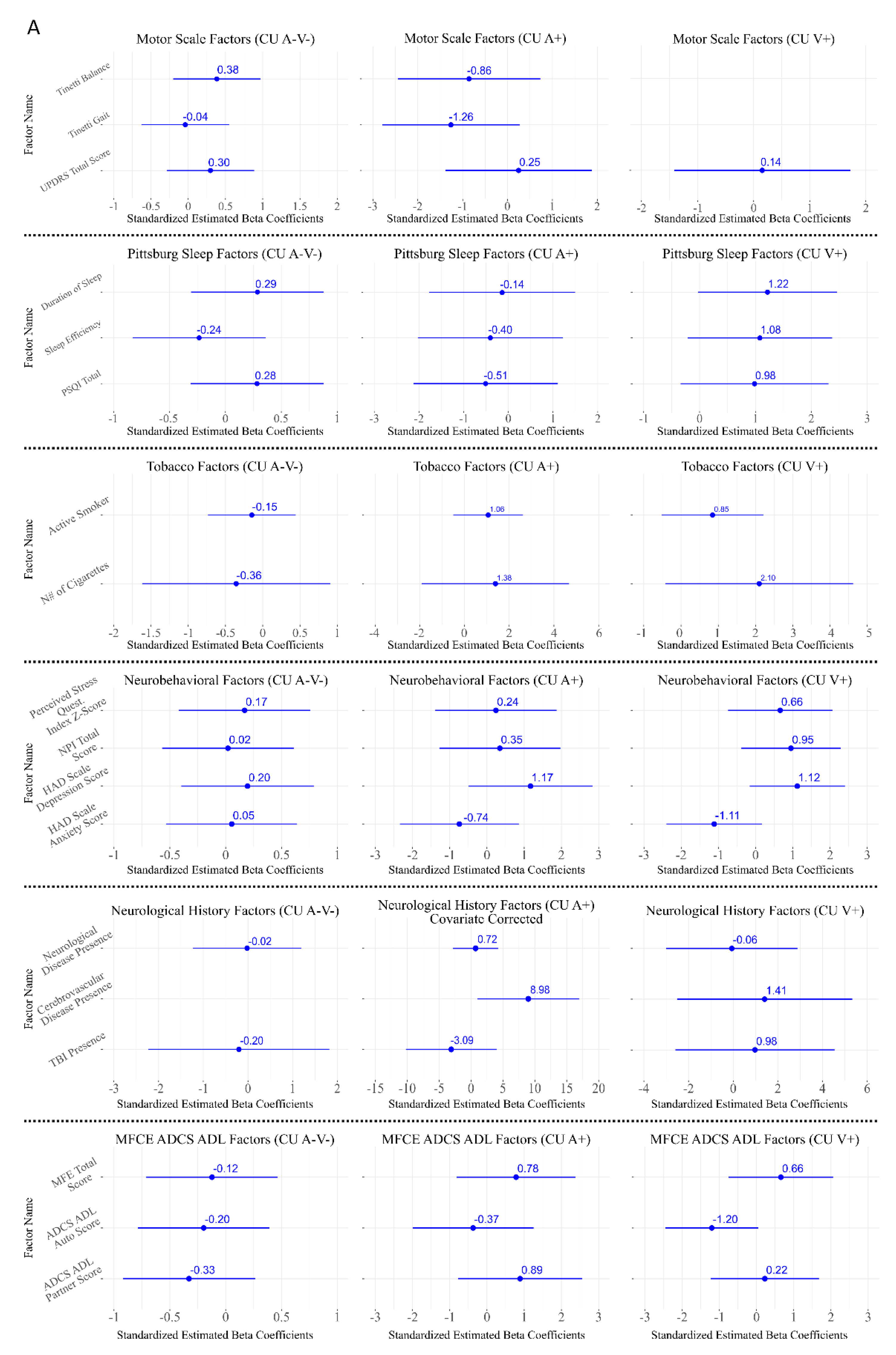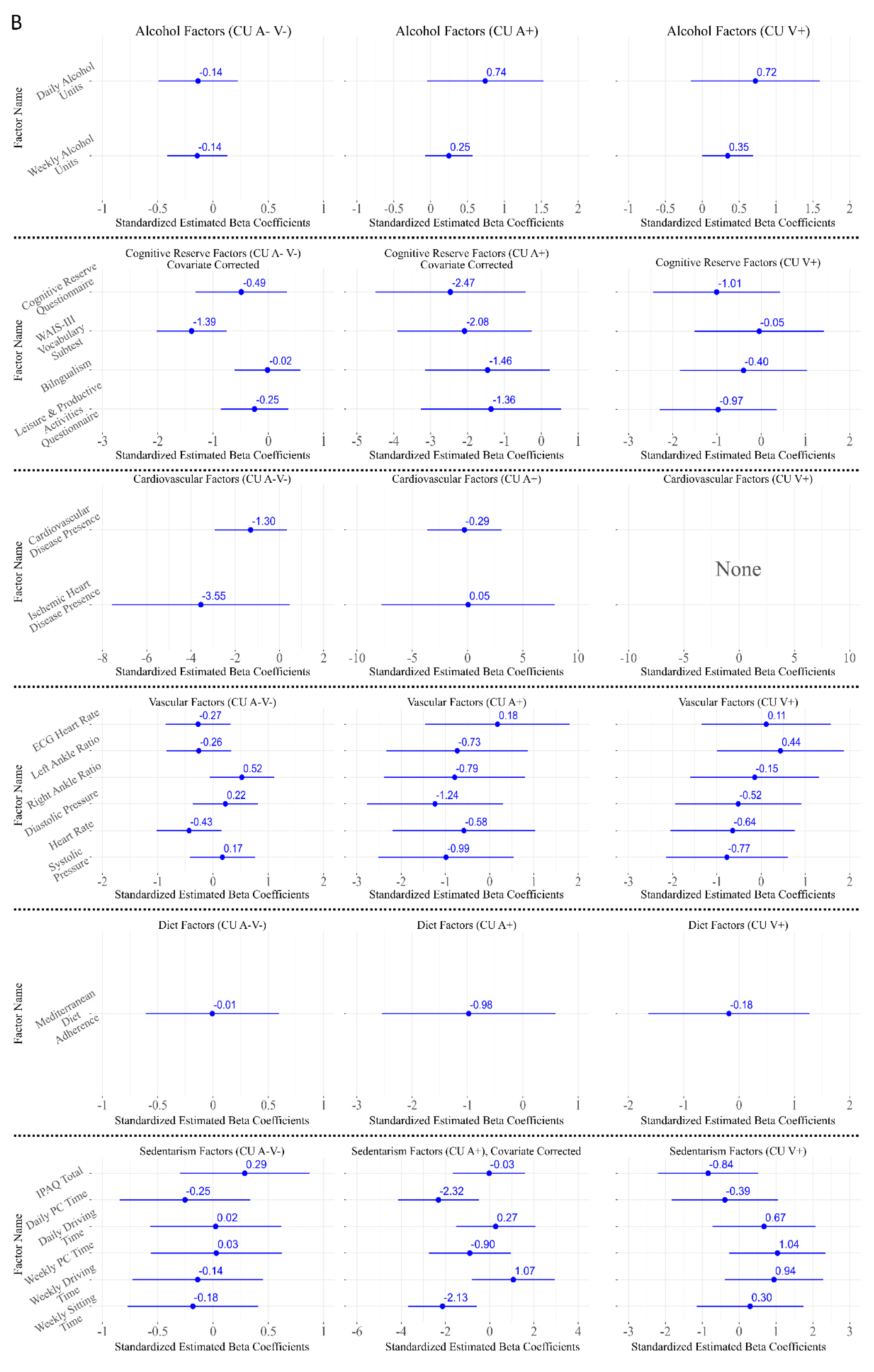 Figure 5. Associations between Cognitive Age Delta (CAD) and the studied factors across Cognitively Unimpaired (CU) subgroups. (A) Includes Motor Scales, Pittsburg Sleep Questionnaire, tobacco use, neurobehavioral symptoms, neurological history, Memory Failures of Everyday Questionnaire (MFCE) and Assessment of Instrumental Activities of Daily Living (ADCS-ADL). (B) Includes alcohol use, cognitive reserve, cardiovascular disease, vascular parameters, diet, and International Physical Activity Questionnaire (IPAQ) and sedentary behavior. Standardized beta coefficients (β) and their 95% confidence intervals are shown for each CU subgroup (CUA−V−, CUA+, and CUV+). If the group title includes “covariate-corrected”, the plot represents the results of the sensitivity analyses after including sex, APOE ε4 load, and years of education as covariates in the GLM. Only Cognitive Reserve– and Sedentarism–related factors remained significant after sensitivity and multiple-comparison corrections (p < 0.05 uncorrected; p < 0.05 FDR-corrected).