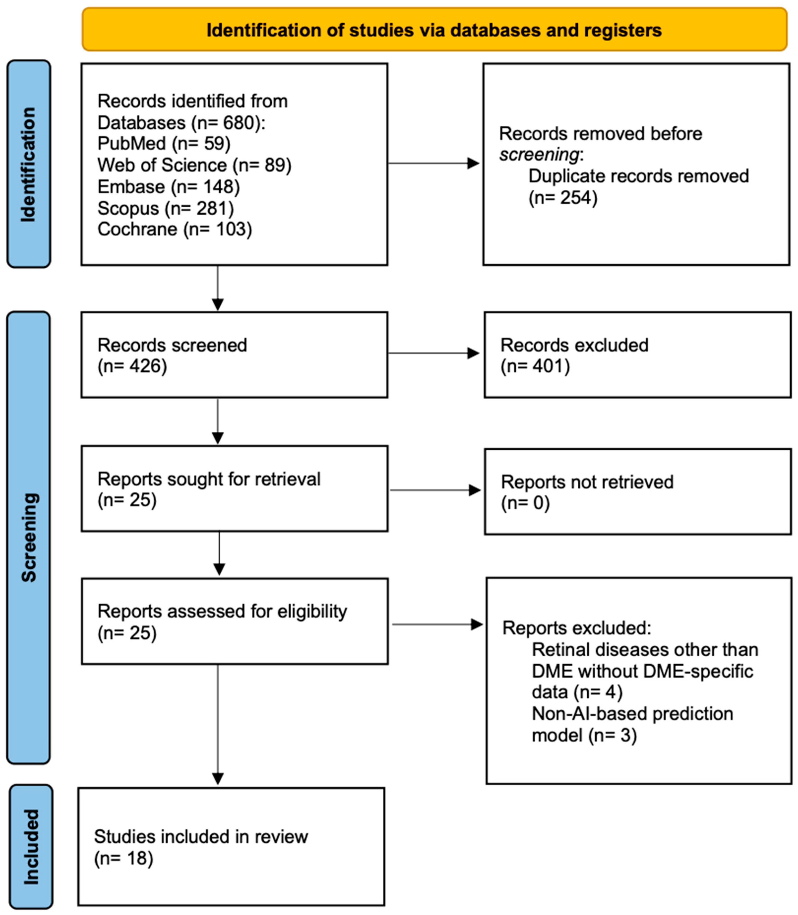Studies were included if they met the following criteria: participants diagnosed with DME receiving anti-VEGF therapy; utilization of AI-based models for predicting treatment response; reporting of diagnostic accuracy metrics including sensitivity, specificity, positive predictive value, negative predictive value, or area under the receiver operating characteristic curve (AUC); use of imaging data such as OCT or fundus photography, clinical variables, or multimodal data as AI model inputs; and study designs including randomized controlled trials (RCTs), prospective cohort studies, or retrospective cohort studies. Studies were excluded if they included non-human subjects; focused on retinal diseases other than DME without DME-specific data; used non-AI-based prediction models; were case reports, editorials, reviews, or conference abstracts without full-text availability; or lacked sufficient data for diagnostic accuracy assessment to be further extracted according to our study aims and goals.