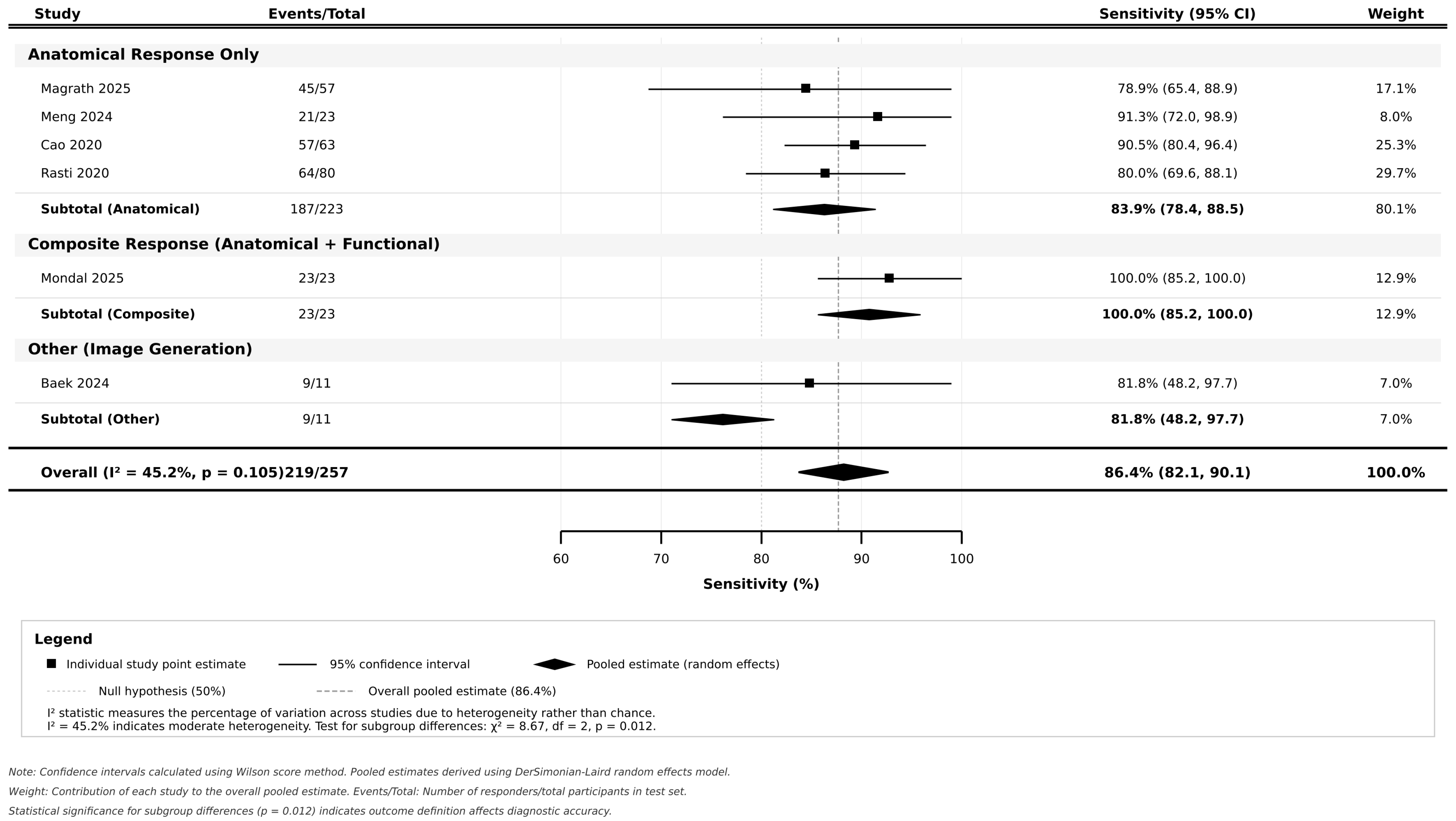 The heterogeneity assessment and meta-regression results are detailed in Table 4 and visualized in Supplementary Figure S1. The meta-regression model identified several significant predictors of diagnostic performance variability. Outcome definition type emerged as a significant predictor (p-value = 0.012), with composite outcomes achieving higher sensitivity (100.0%) compared to anatomical-only definitions (83.9%). Follow-up duration also significantly impacted performance (p-value = 0.045), with studies using longer follow-up periods (>three months) demonstrating superior sensitivity (94.1%) compared to shorter durations (≤one month: 78.9%). Input data modality showed a trend toward improved performance with multimodal approaches (94.1% sensitivity) versus OCT-only methods (84.5% sensitivity), though this difference did not reach statistical significance (p-value = 0.224). Sample size showed a weak positive association (β = 0.003, p-value = 0.128), suggesting that larger studies provide more stable estimates.