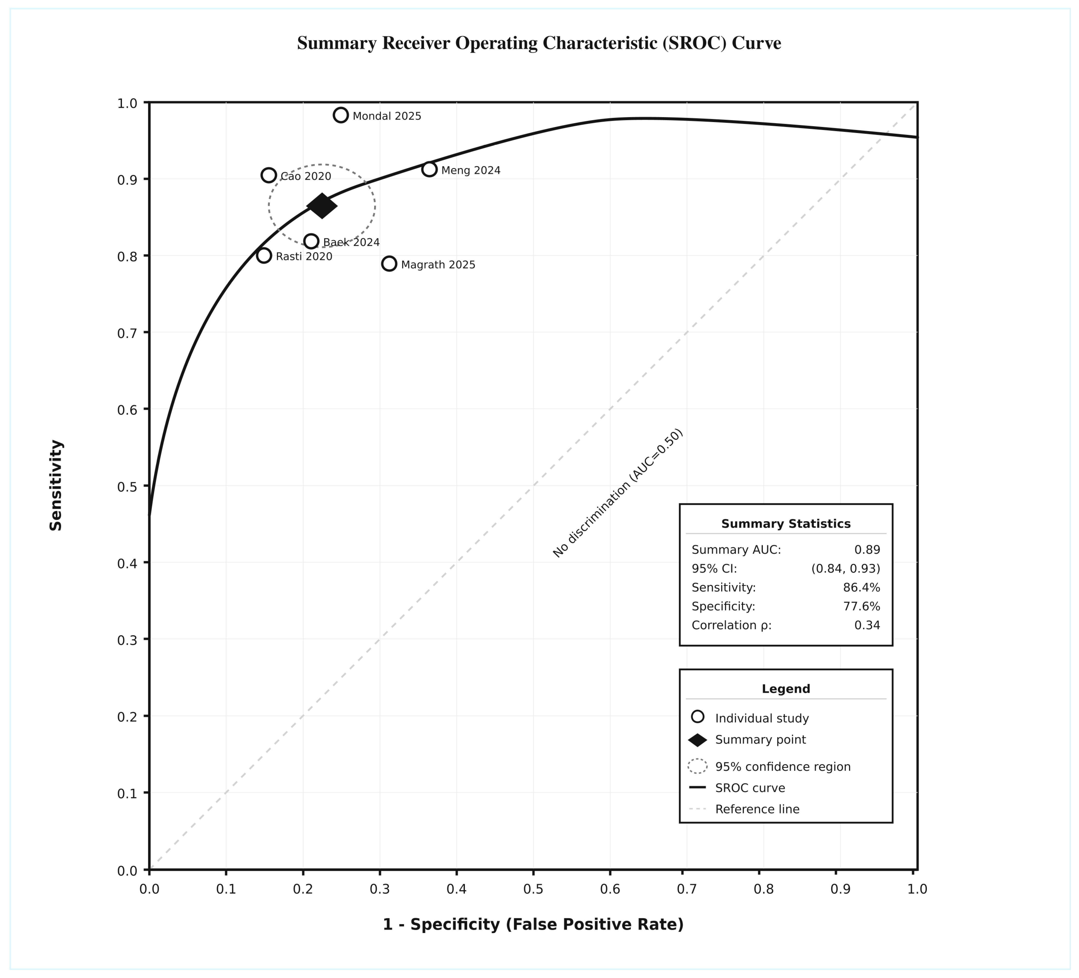 The summary AUC is presented in Figure 3, demonstrating excellent discriminative ability with an AUC of 0.89 (95% CI: 0.84–0.93). The summary point, representing the pooled sensitivity and specificity estimates, was positioned in the upper left quadrant of the ROC space, indicating good diagnostic performance. The bivariate model indicated moderate correlation between sensitivity and specificity (ρ = 0.34), justifying the use of the bivariate random effects.