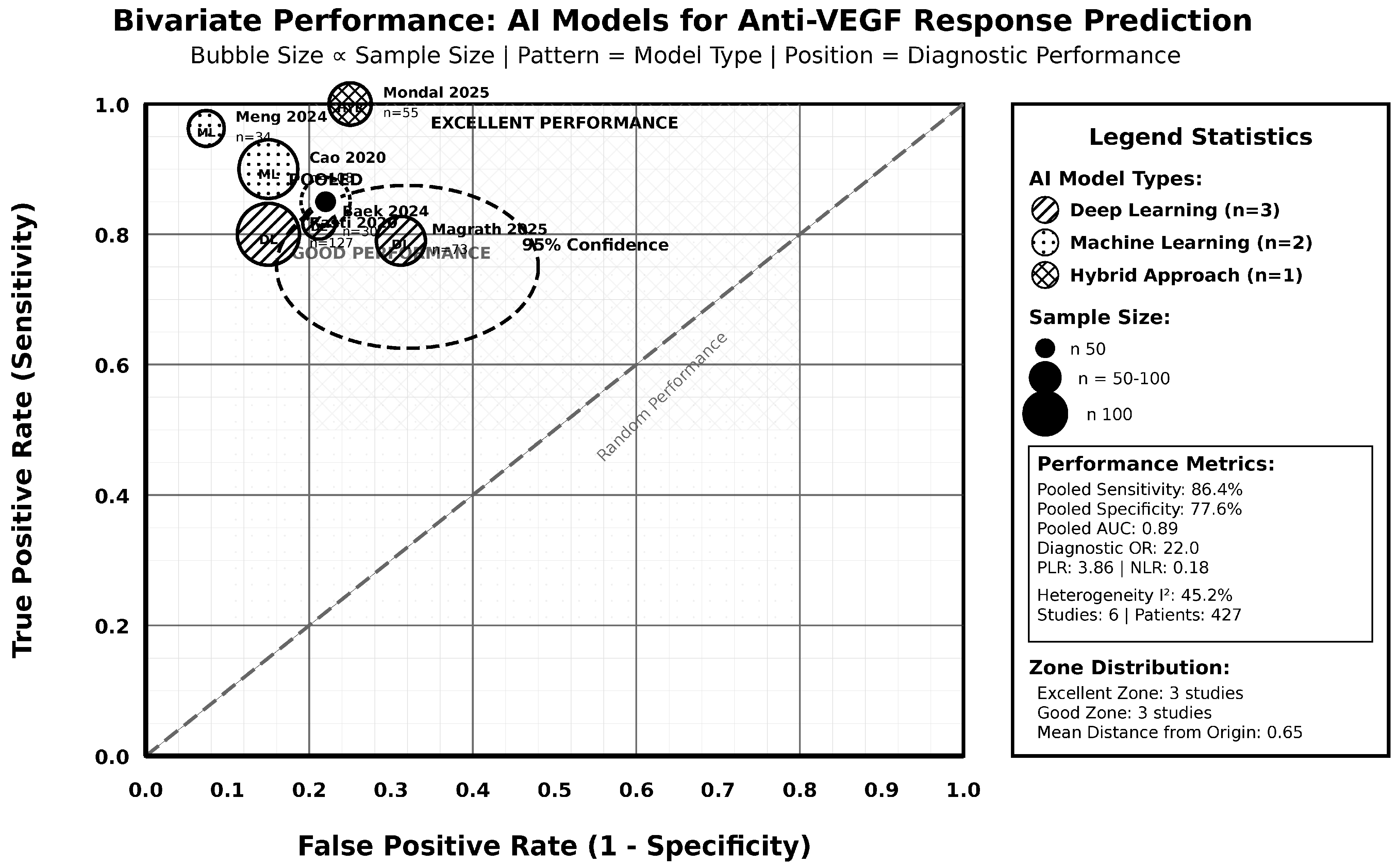 The treatment protocols and response definitions varied across studies, as detailed in Table 2. Anti-VEGF agents included ranibizumab, aflibercept, bevacizumab, brolucizumab, and conbercept, with dosing regimens ranging from single injections to monthly protocols and treat-and-extend approaches. Response definitions included various criteria such as central macular thickness reduction thresholds (ranging from >10 μm to >50 μm), visual acuity improvements (≥5 ETDRS letters or >0.1 LogMAR), and composite outcomes combining anatomical and functional measures. Among the six studies providing complete diagnostic accuracy data, the individual study sensitivity ranged from 78.9% to 100.0%, while the specificity ranged from 68.8% to 92.6%. The AUC, when reported, varied from 0.810 to 0.998.