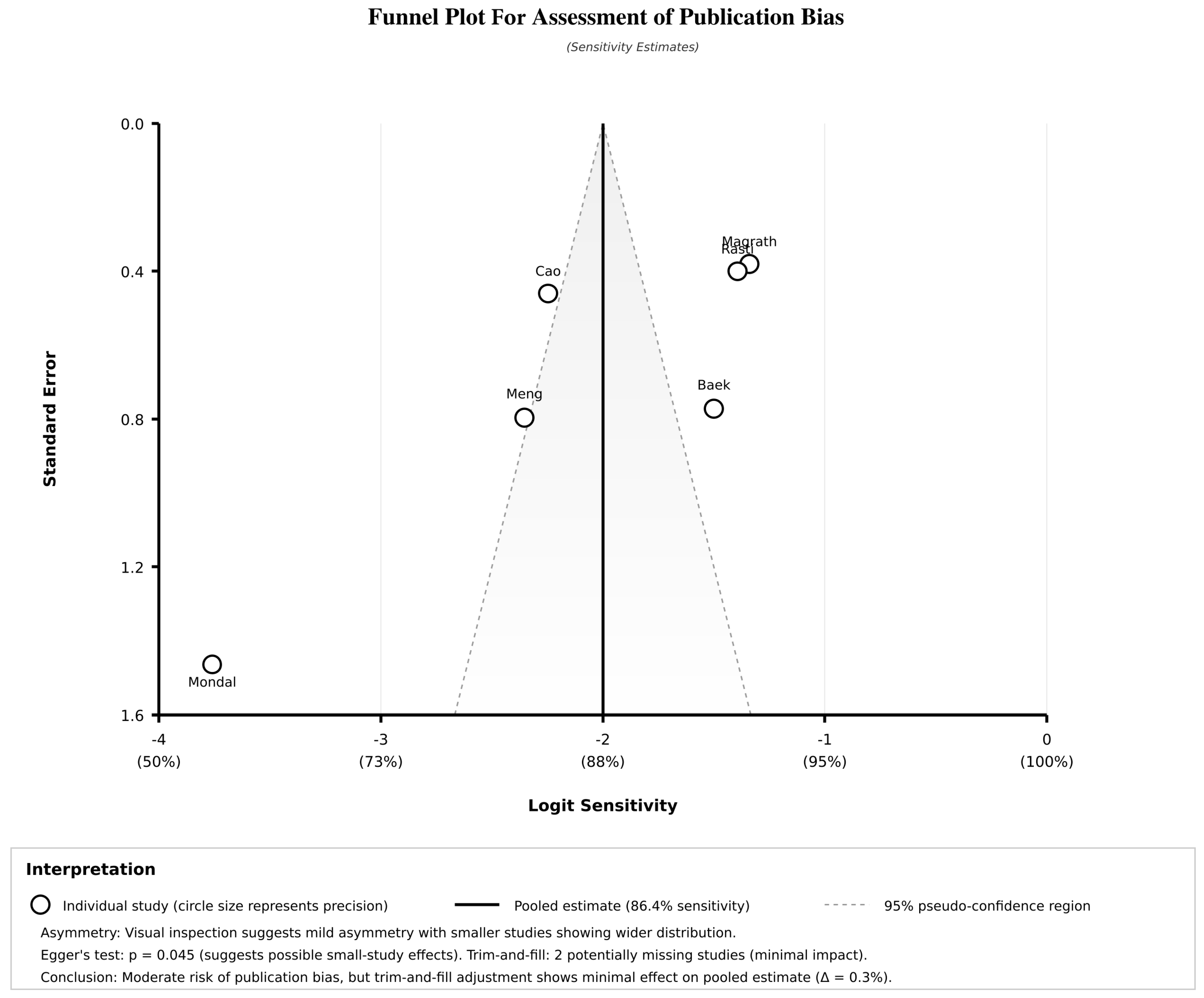 Comprehensive sensitivity analyses and publication bias evaluation are presented in Table 6. The leave-one-out assessment demonstrated the stability of the results, with pooled sensitivity estimates ranging from 85.0% to 88.5% and specificity from 75.2% to 78.6% when individual studies were sequentially excluded. Excluding studies with a high risk of bias improved the pooled estimates to 88.5% sensitivity (95% CI: 84.1–92.9%) and 78.6% specificity (95% CI: 72.1–85.1%). Studies with external validation demonstrated superior performance (91.7% sensitivity) compared to those without external validation (81.8% sensitivity, p-value = 0.034). The publication bias assessment revealed mixed findings, with Egger’s regression test suggesting possible small study effects (p-value = 0.045), while Begg’s rank correlation showed no significant bias (p-value = 0.280). The trim-and-fill adjustment method indicated the minimal impact of the possible risk of publication bias, with adjusted estimates showing only marginal changes (sensitivity: 85.1%, specificity: 76.8%). The failsafe N analysis suggested that 15 additional negative studies would be required to nullify the observed effect, indicating significant evidence.