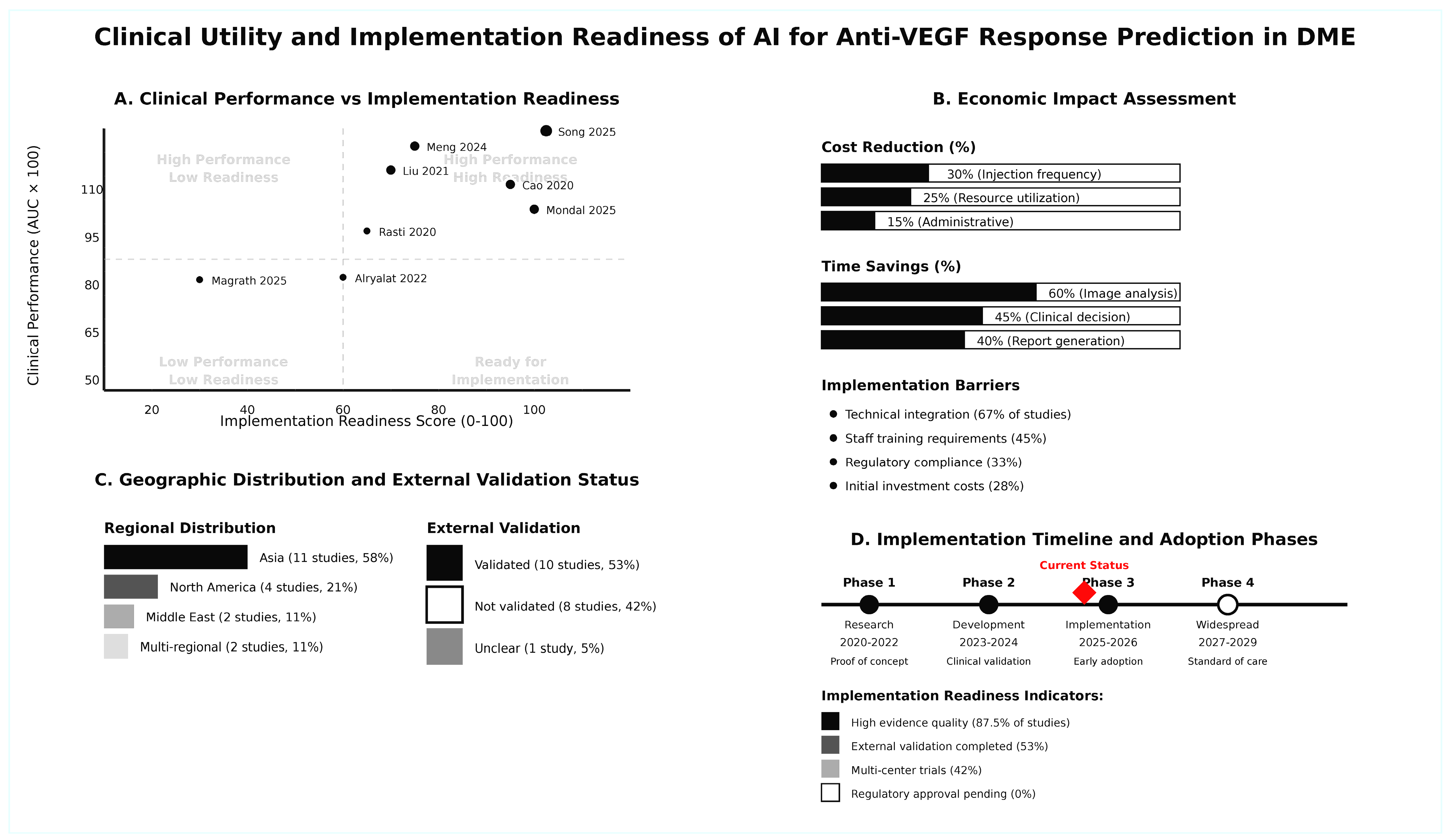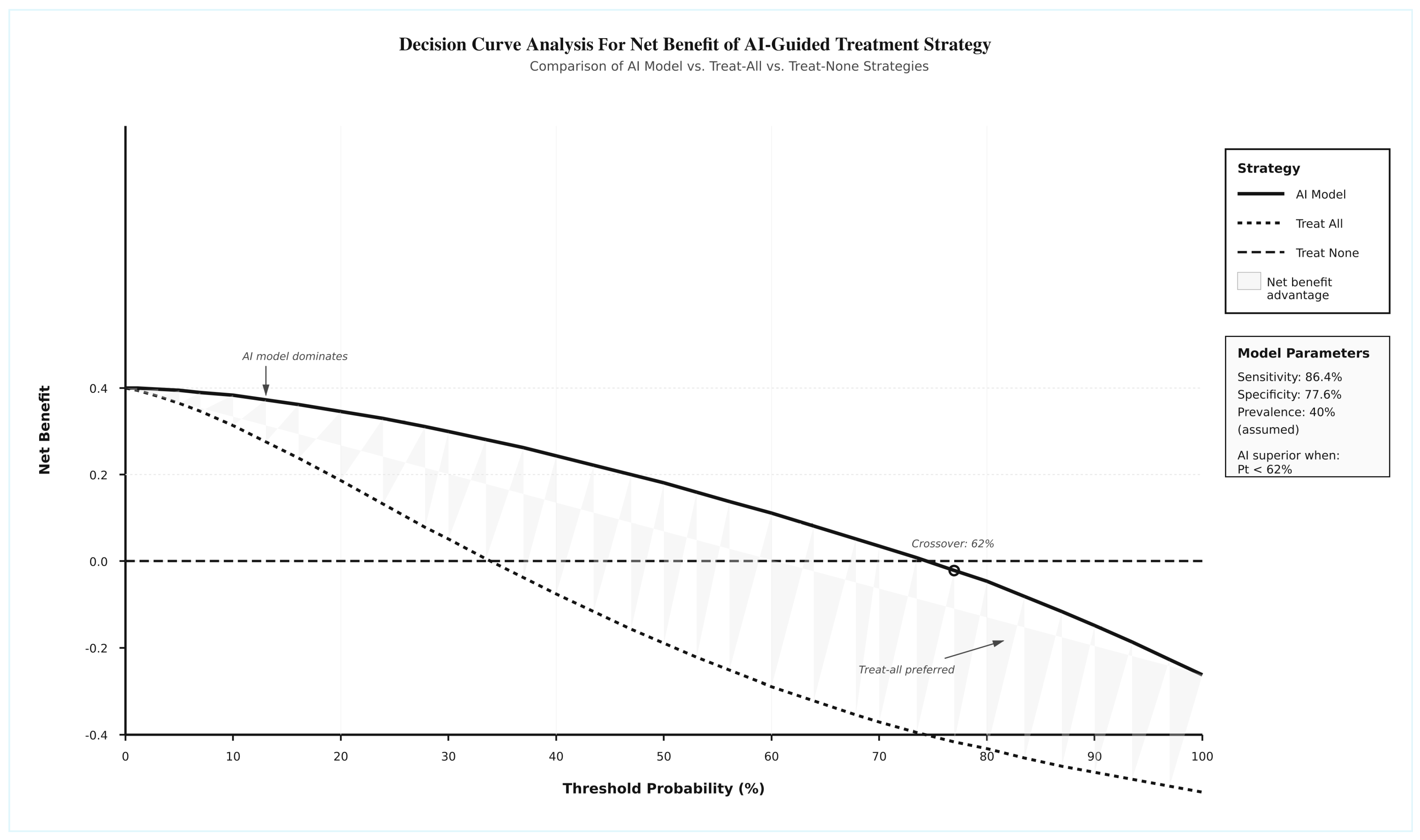 The clinical utility and implementation readiness were illustrated in a diagram and are presented in Figure 6. The implementation readiness matrix revealed that several studies achieved high clinical performance with varying degrees of implementation readiness. Economic impact assessment demonstrated significant possible benefits, including cost reductions of 15–30% and time savings of 40–60% in various clinical processes. However, implementation barriers were identified, with technical integration challenges reported in 67% of studies, staff training requirements in 45%, regulatory compliance concerns in 33%, and initial investment costs in 28% of studies. Geographic distribution showed a predominance of Asian studies (58%), with 53% of studies having completed external validation. The implementation timeline indicated current positioning in Phase III (Implementation/Early adoption phase, 2025–2026), with progression toward widespread adoption (Phase IV) expected by 2027–2029. Implementation readiness indicators showed high evidence quality in 87.5% of studies, external validation completion in 53%, and multi-center trials in 42%, but no regulatory approvals currently pending. The decision curve analysis (Figure 7) demonstrates the clinical utility of AI-based prediction models compared to treat-all and treat-none strategies across varying threshold probabilities. The AI model provides net benefit over the treat-all strategy when the threshold probability is below 62%, indicating that AI-guided decision-making is clinically superior for patients with a moderate-to-high likelihood of treatment response. At threshold probabilities above 62%, the treat-all strategy becomes preferable. This analysis, based on pooled diagnostic accuracy estimates (sensitivity 86.4%, specificity 77.6%) and an assumed DME treatment response prevalence of 40%, supports the clinical utility of AI models for personalized treatment planning in real-world settings where resource optimization is critical.