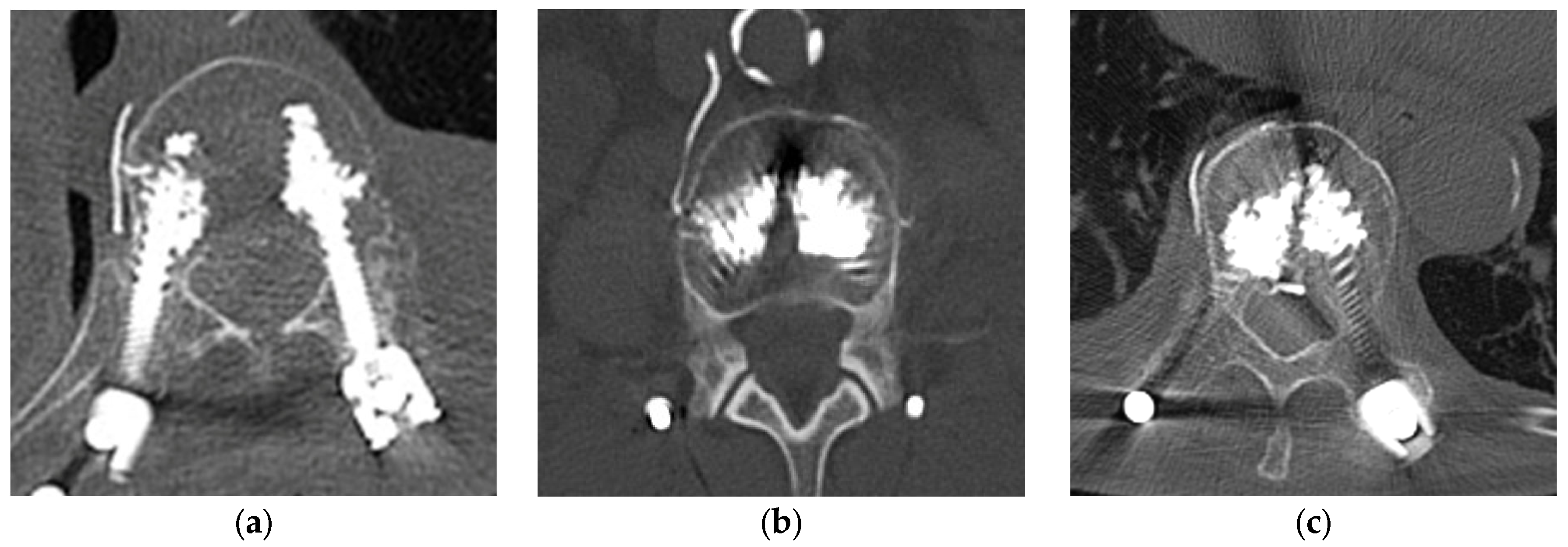 - Takahashi, S.; Sakai, D.; Ogasawara, S.; Sasaki, R.; Uematsu, M.; Hyakumachi, T.; Hiyama, A.; Katoh, H.; Terai, H.; Suzuki, A.; et al. The risk of intravenous cement leakage and short-term outcomes of selective cement-augmented pedicle screws: A multicenter retrospective study. Clin. Spine Surg. 2024, 38, E419–E424. [Google Scholar] [CrossRef]