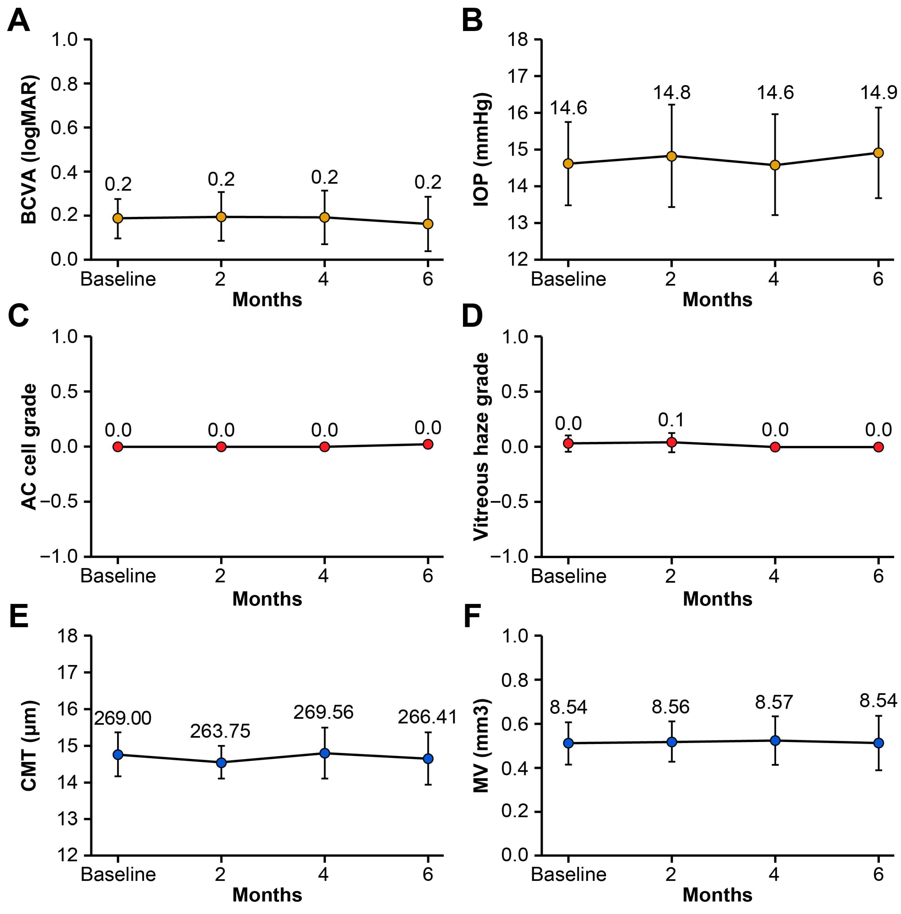 No significant changes in BCVA (logMAR), IOP (mmHg), AC cell grade, vitreous haze grade, CMT (μm), or MV (mm