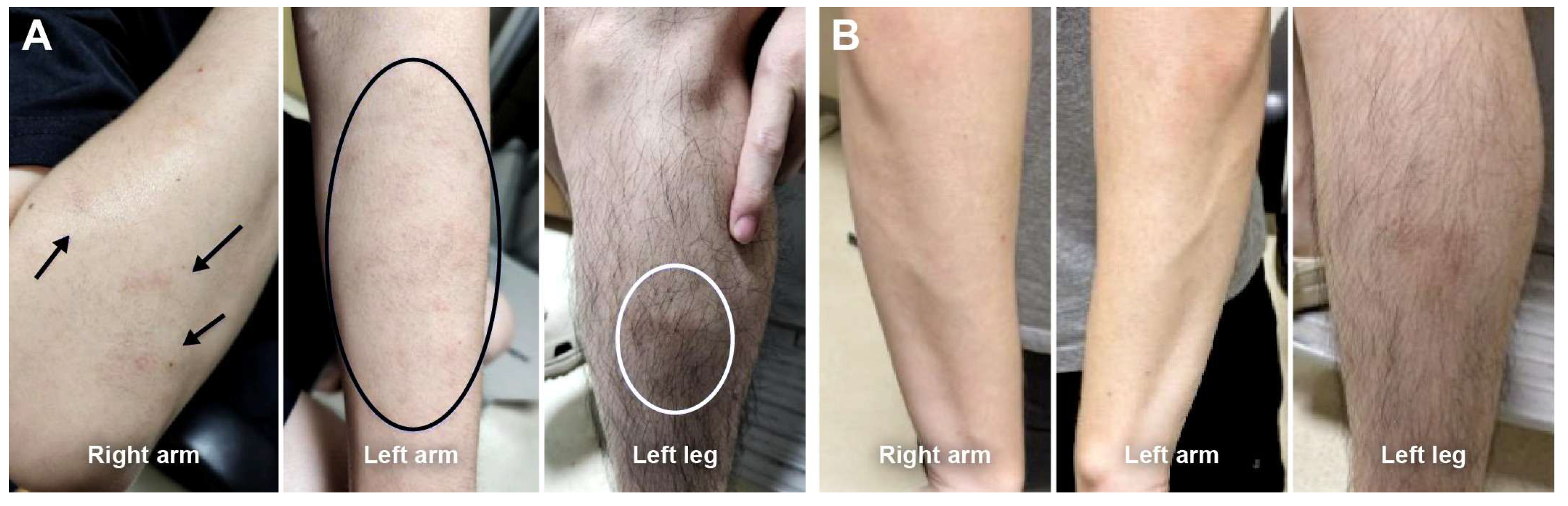 In our cohort, 5 patients (28%) re-switched to the adalimumab originator: 2 patients due to injection-site discomfort and 3 due to extremity rashes (2 involving both upper and lower extremities and 1 confined to the lower extremities). The reasons for re-switching were comparable to those reported in previous studies [