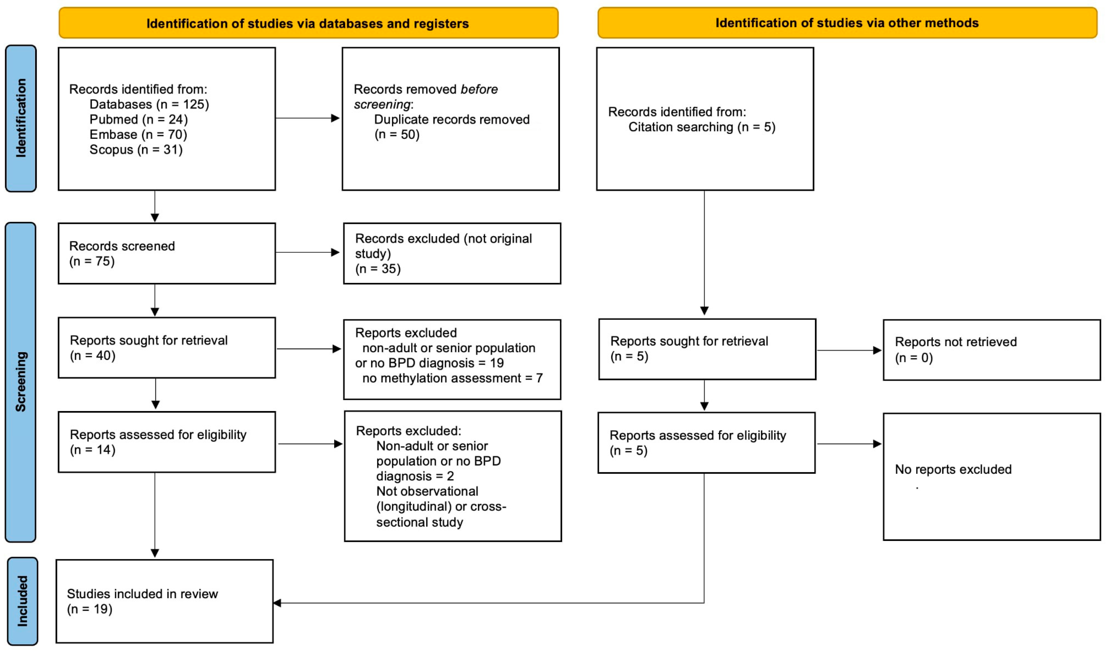 | Teschler et al. [22] | 2016 | BPD = 24, HC = 11 | BPD = 24 HC = 11 | BPD: 33 + 11, HC: 32 ± 7 | As in Damman (2011) | BPD = 24, HC not reported | whole blood samples | None | None | rDNA promoter region, promoter of PRIMA) | In female BPD patients, the PRIMA1 promoter showed hypermethylation and the ribosomal RNA (rDNA) gene showed hypomethylation. |