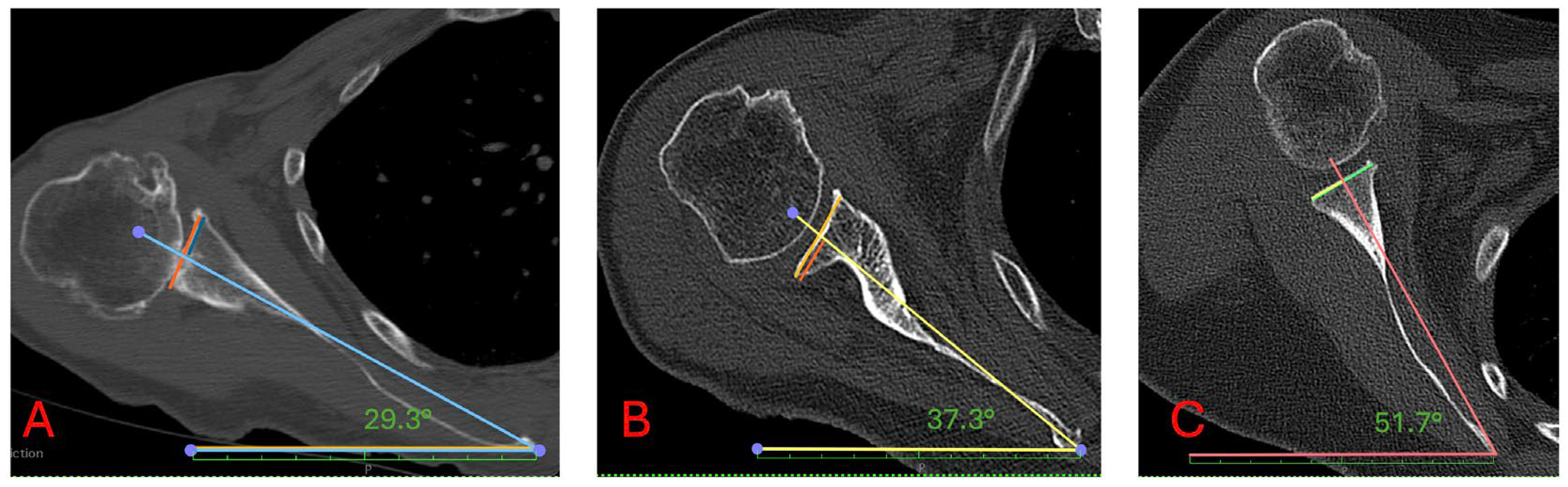- Siegert, P.; Meraner, D.; Pokorny-Olsen, A.; Akgün, D.; Korn, G.; Albrecht, C.; Hofstaetter, J.G.; Moroder, P. Practical considerations for determination of scapular internal rotation and its relevance in reverse total shoulder arthroplasty planning. J. Orthop. Surg. 2023, 18, 279. [Google Scholar] [CrossRef]