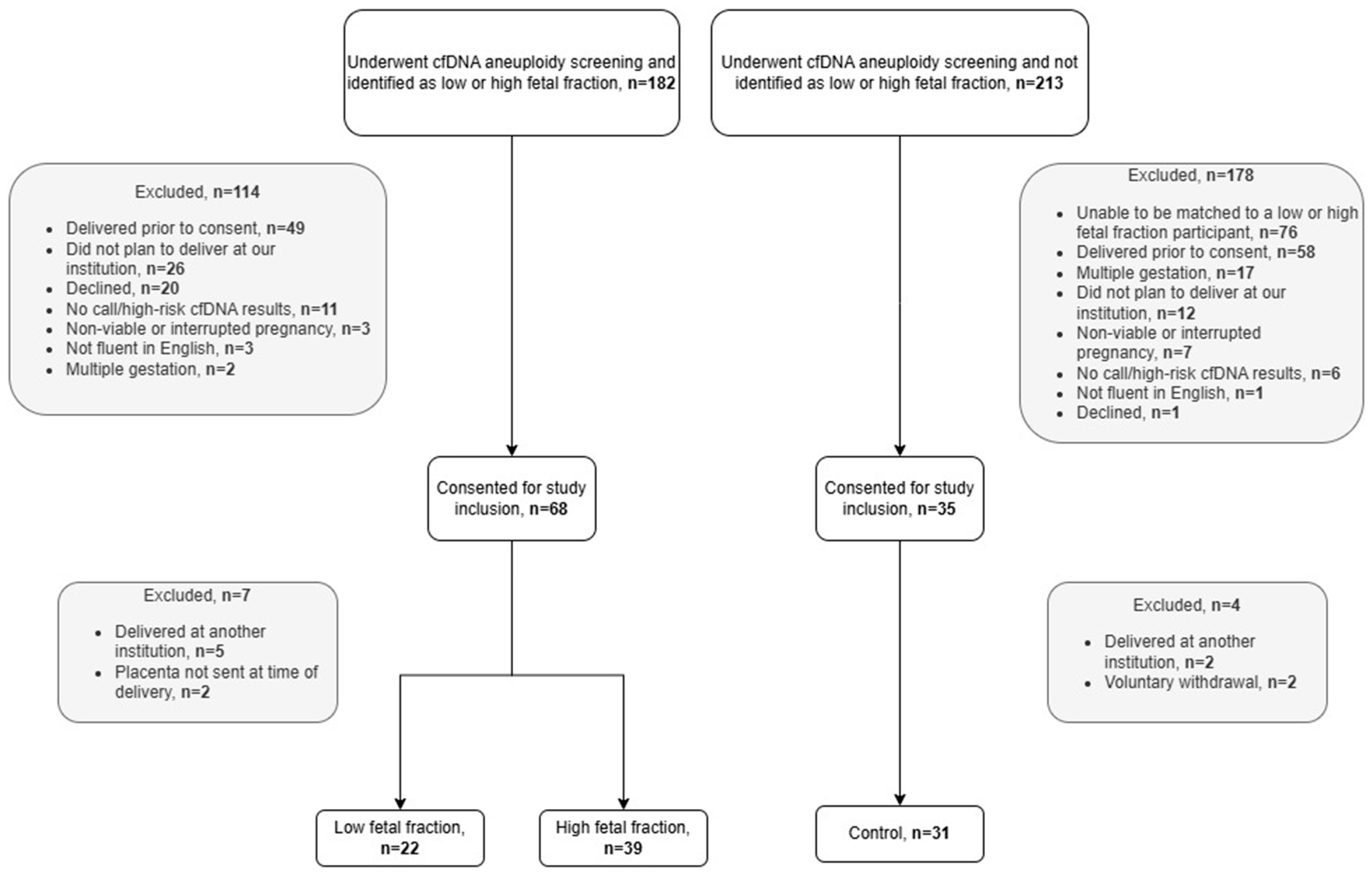 Out of the 182 pregnant individuals who underwent NIPS and were identified as having low or high fetal fraction during the study period, 68 individuals were consented, including 22 in the low fetal fraction group and 39 in the high fetal fraction group. An additional 213 pregnant individuals underwent NIPS during the study period and were considered for inclusion in the control cohort. In total, 35 individuals consented to study participation after matching. Reasons for exclusions and attrition in these groups are outlined in Figure 1.