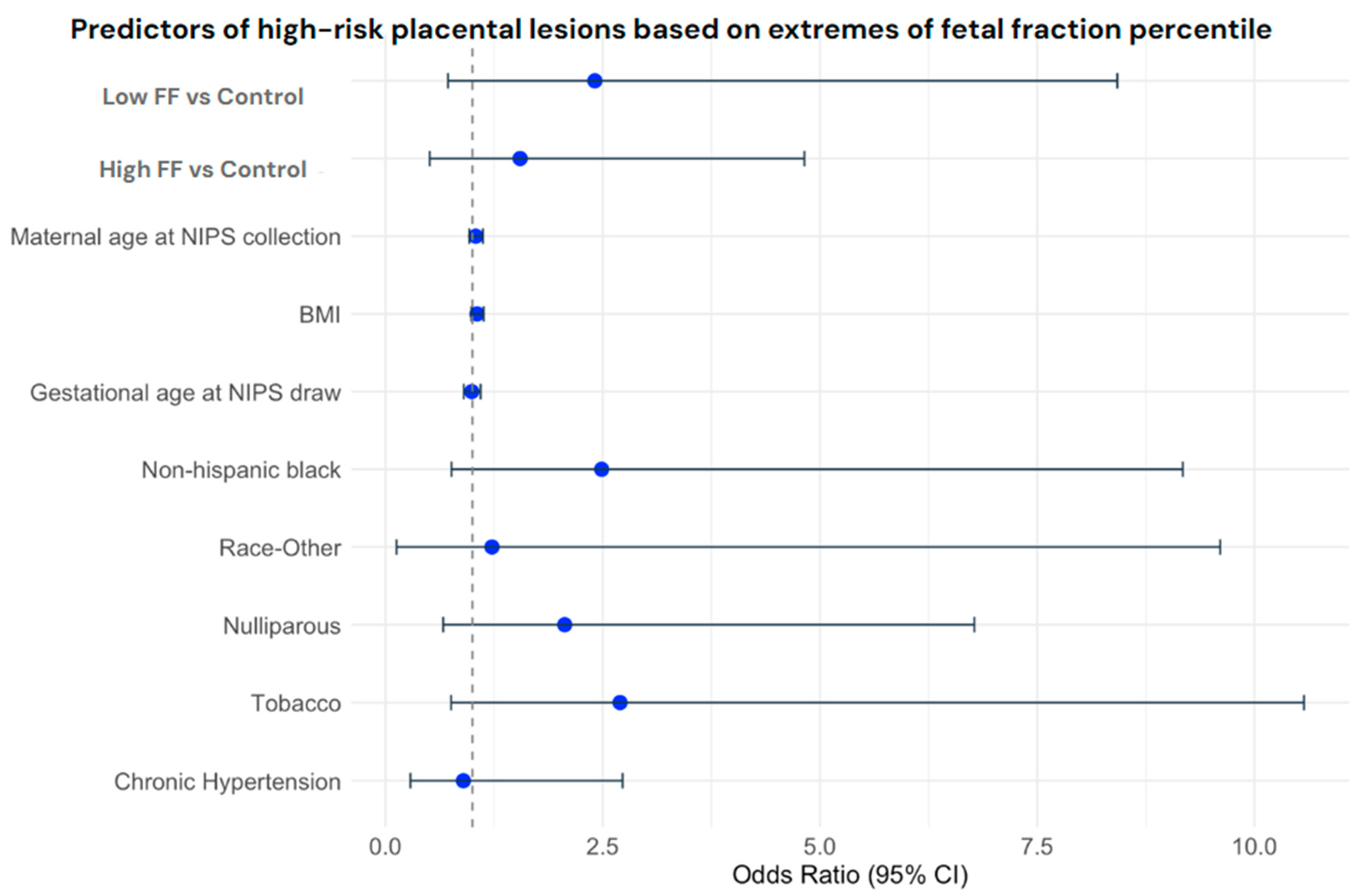 Demographic and clinical characteristics as well as maternal and neonatal clinical outcomes were compared across the three study groups—i.e., patients with high FF (≥95th percentile), low FF (≤5th percentile) and those in the control group (FF between the 6th and 94th percentile) using one-way Analysis of Variance (ANOVA) or the Kruskal–Wallis test for continuous variables (depending on normality of distribution) and chi squared or Fisher’s exact test for categorical variables, as applicable. Similarly, the occurrence of each of the prespecified histopathology findings, as well as the primary study outcome overall, was compared across the three study groups using the chi-squared or Fisher’s exact test, as appropriate. Multivariable regression analyses were undertaken to predict the likelihood of identifying the primary study outcome (high-risk placental lesions) based on the fetal fraction percentile, while adjusting for maternal age, BMI, gestational age at time of NIPS, self-identified race, nulliparity, tobacco use, and chronic hypertension. A similar regression was performed for selected obstetric and neonatal outcomes, including hypertensive disorders of pregnancy, gestational diabetes, spontaneous preterm birth, fetal growth restriction, and NICU admission. Statistical significance was set at p ≤ 0.05. All analyses were performed using RStudio (version 2023).