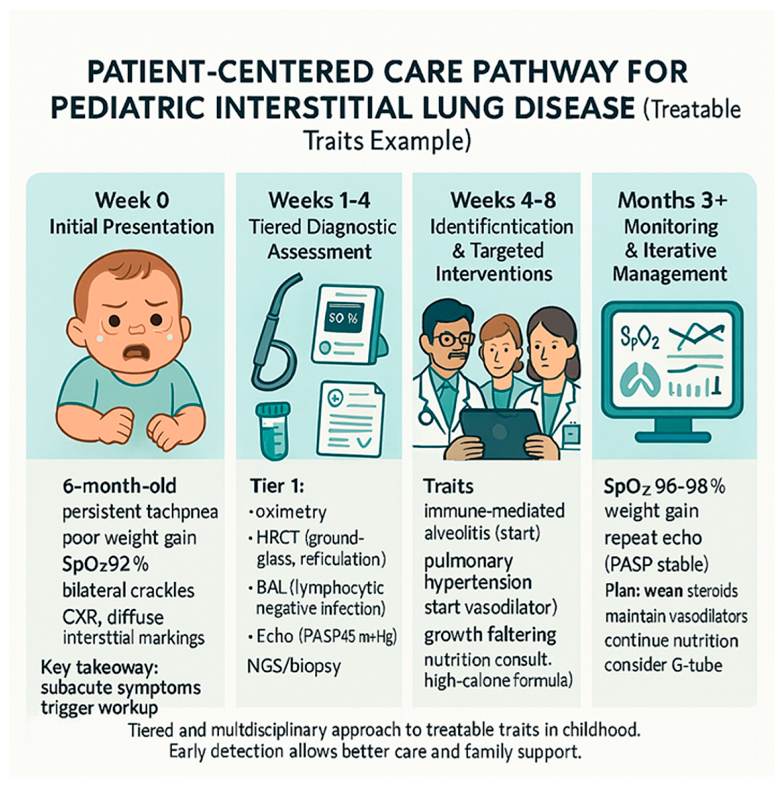 Applying the treatable traits framework to pediatric ILD holds great promise. Many traits—such as pulmonary hypertension, surfactant failure, immune dysregulation, or aspiration—are modifiable and amenable to specific therapeutic interventions. Early recognition through advanced diagnostics (genetic testing, bronchoalveolar lavage, imaging, biomarkers) can facilitate targeted therapy, potentially improving outcomes and quality of life. Moreover, structuring care around traits could foster more efficient research, data sharing, and registry development by grouping patients based on actionable features rather than rare diagnoses alone [