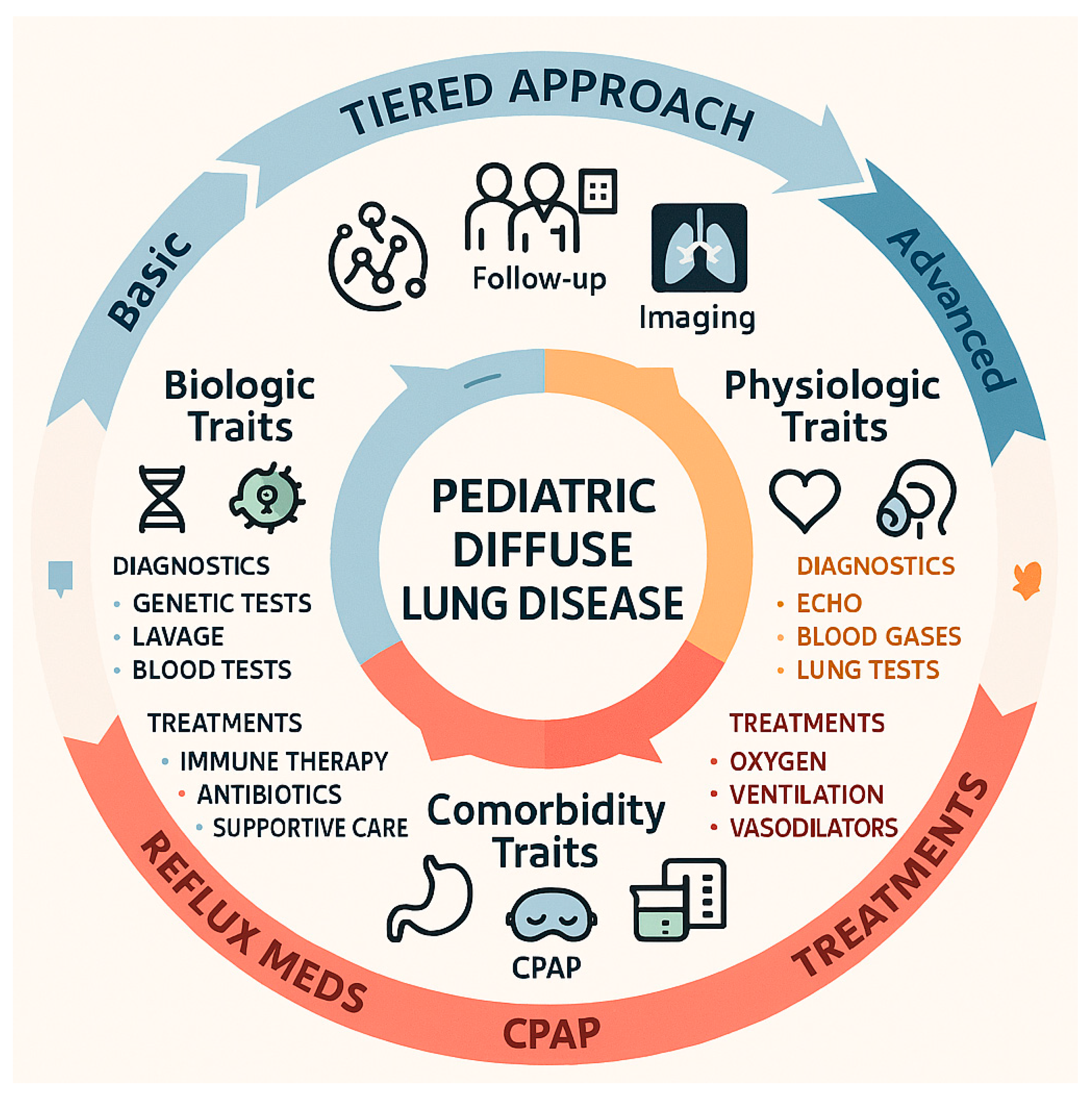 58]. Practically, trait identification should follow a tiered diagnostic approach—baseline clinical assessment and imaging, intermediate testing (pulmonary function, bronchoscopy with lavage, echo, reflux studies), and advanced investigations (next-generation genetic panels, lung biopsy, right-heart catheterization)—with multidisciplinary prioritization of traits by reversibility and urgency; recognizing that many traits coexist, clinicians must balance simultaneous interventions while acknowledging that pediatric-specific evidence for several targeted therapies remains limited and requires prospective study (