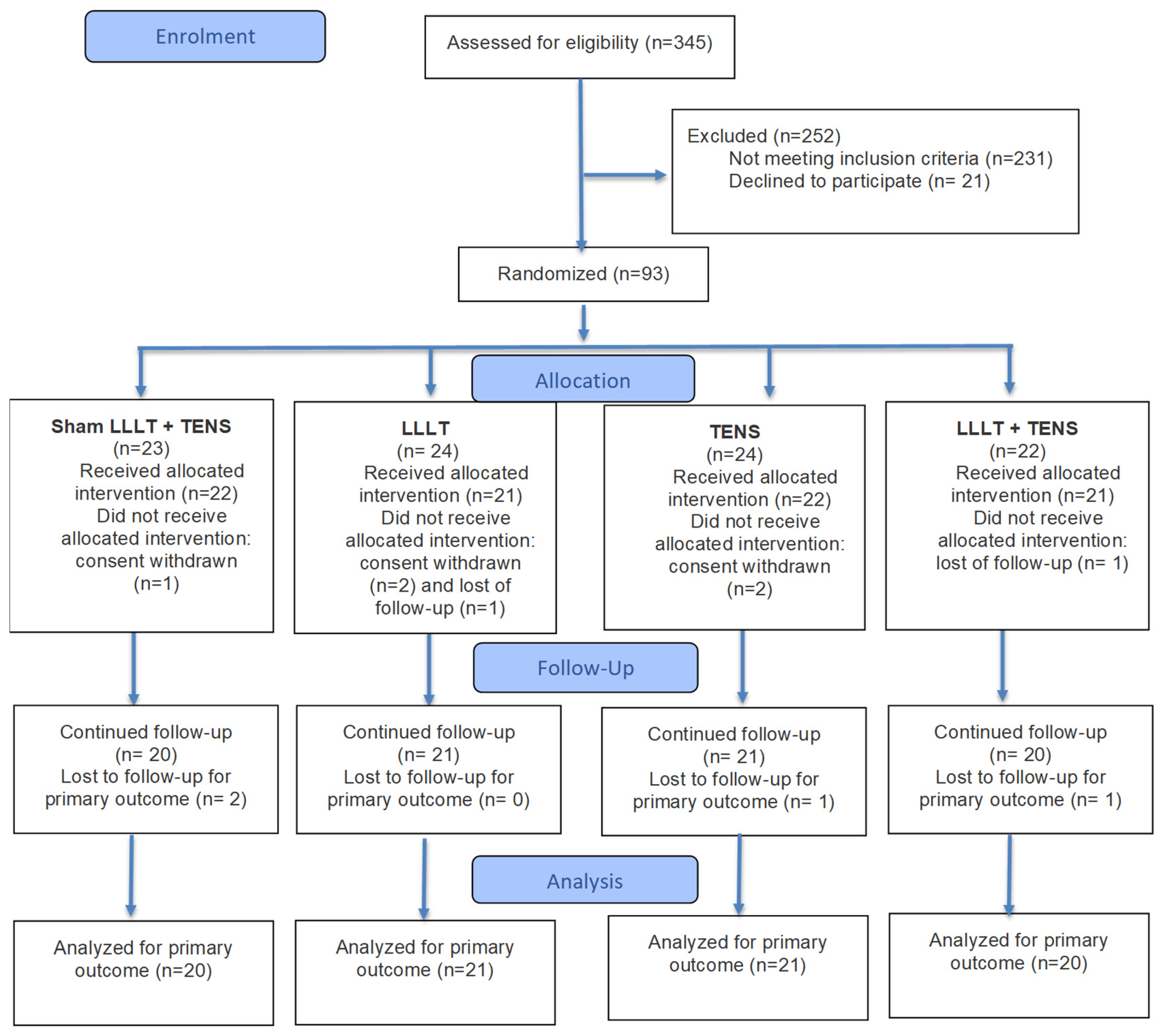 Randomization: The remaining 93 patients were randomized into four groups: 23 patients received sham LLLT and sham TENS (control group), 22 patients passed LLLT (LLLT group), 23 patients underwent TENS (TENS group), and 23 patients were treated by combined LLLT and TENS (LLLT + TENS group).