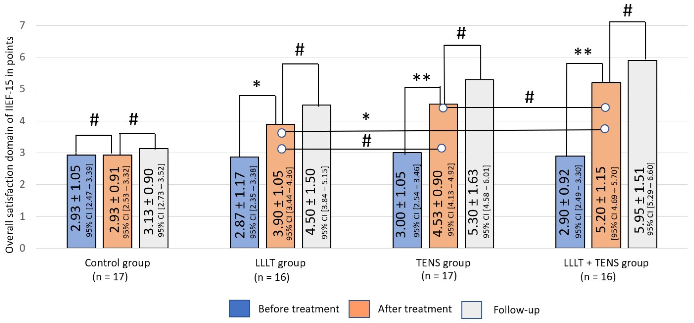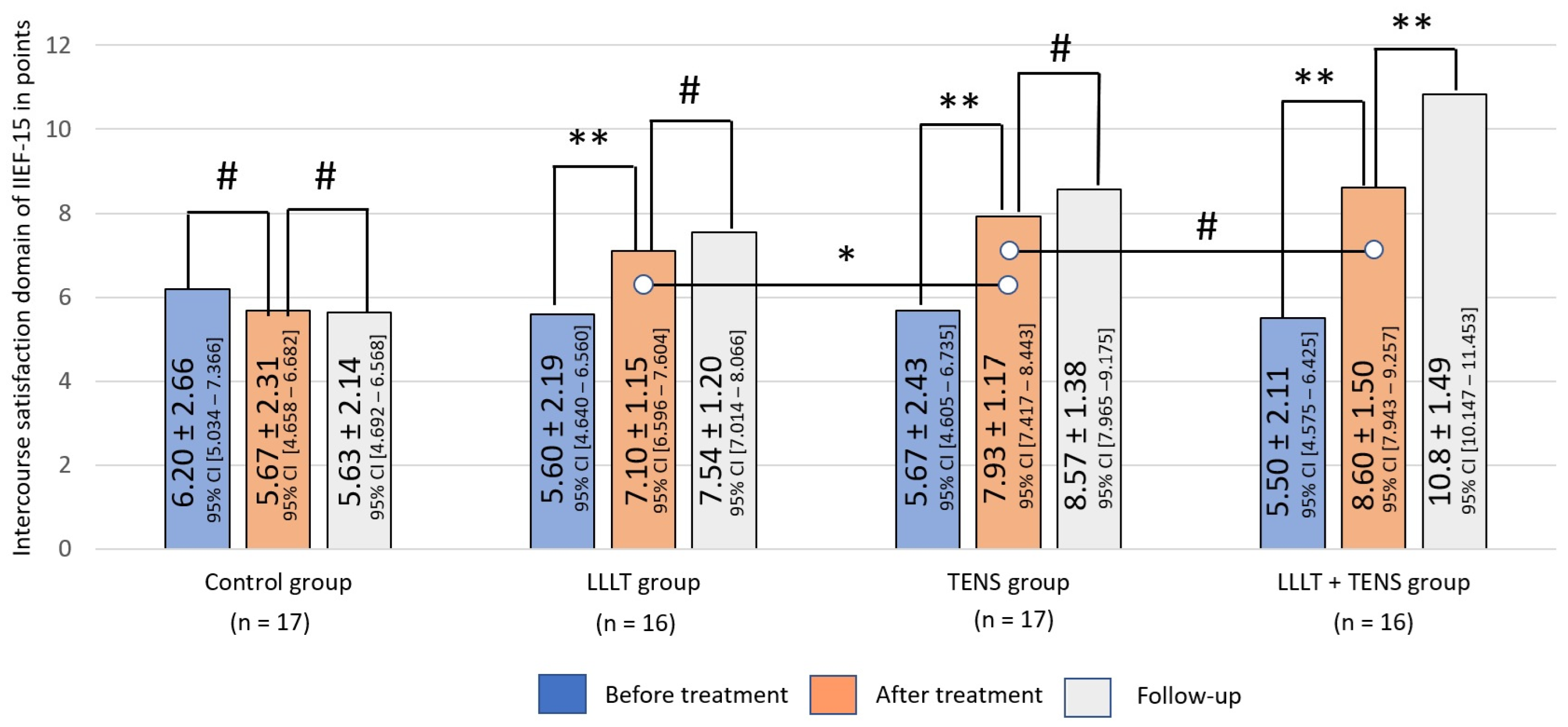 Figure 9. Dynamics of overall satisfaction of IIEF-15 in the study groups. Notes—LLLT—low-level laser therapy, TENS—transcutaneous electrical nerve stimulation, #—p > 0.05, *—p ≤ 0.05, and **—p ≤ 0.01. The black lines highlight the significant differences between the values in the connected columns.