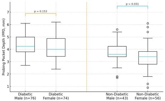 In the diabetic cohort, male participants exhibited higher mean PPD and CAL compared with females, suggesting a more severe periodontal profile in men. A similar but less pronounced pattern was observed in the non-diabetic group. Age demonstrated a positive trend with periodontal severity, with older individuals showing deeper pockets and greater attachment loss in both cohorts. These descriptive trends indicate that sex may act as a modifying factor in the periodontal response, potentially interacting with systemic metabolic status (Figure 1).