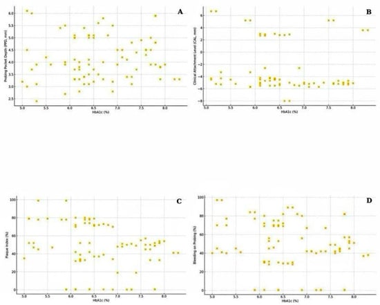 Scatterplots showing the association between glycated hemoglobin (HbA1c) and (A) probing pocket depth (PPD), (B) clinical attachment level (CAL), (C) plaque index (PI), and (D) bleeding on probing (BOP) in the diabetic group.