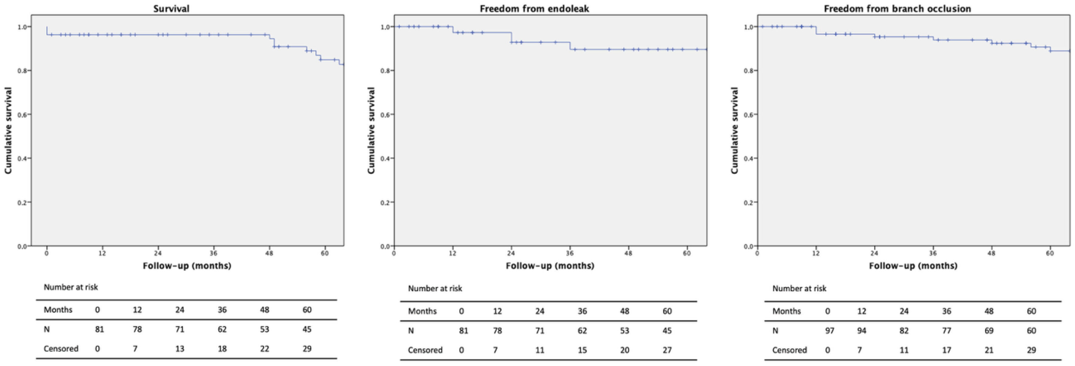 The median patient follow-up time was 64.7 months (range 1–120 months). Conversion to open surgery was not necessary. During follow-up, 15 additional patients died, resulting in an overall mortality of 22.2% with no aneurysm-related deaths (Figure 2). The estimated survival at 1, 3, and 5 years was 96.3%, 88.9%, and 71.2%, respectively (Table 5). Eleven cases (13.6%) of myocardial infarction and one stroke (1.2%) occurred during follow-up. Buttock claudication was observed in five (6.2%) patients and nerve ischemia in one (1.2%). The patency of the iliac branch and bridging stent was 90.1%. One type I endoleak (1.2%) occurred after endovascular treatment of an isolated common iliac artery aneurysm, and three type II endoleaks (3.7%) were observed; however, none were associated with aneurysm sac enlargement during the radiological surveillance. Three type III endoleaks (3.7%) occurred due to disconnection of the iliac branch from the concomitant EVAR extension. Four reinterventions (4.9%) were performed during follow-up.
