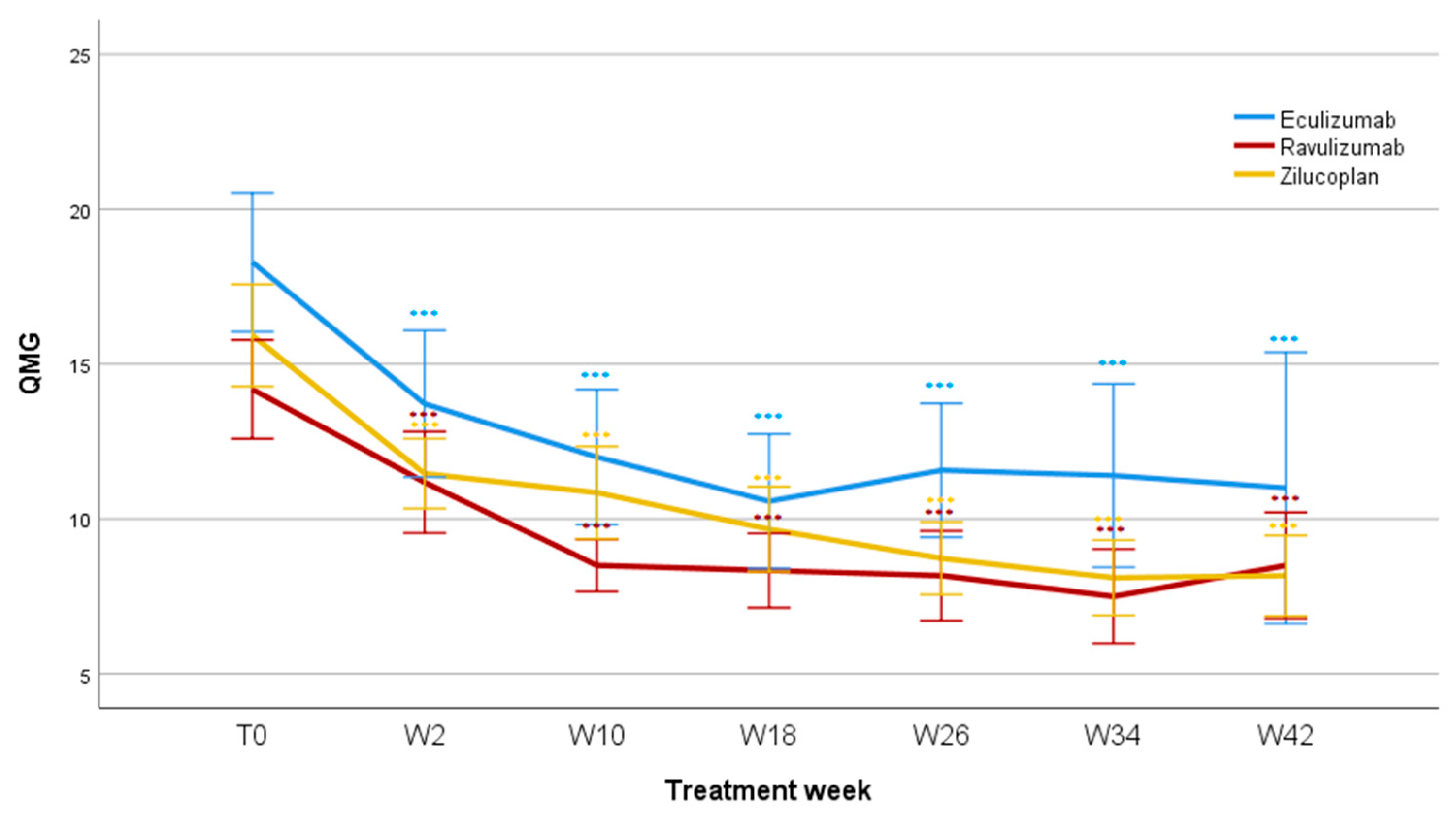The difference was already significant after two weeks (F = 55.3; p < 0.001) and remained significant after 10 weeks (F = 57.1; p < 0.001), 18 weeks (F = 60.3; p < 0.001), 26 weeks (F = 49.9; p < 0.001), 34 weeks (F = 50.3; p < 0.001), and 42 weeks of treatment (F = 32.4; p < 0.001). Mean QMG values reduced for Eculizumab from 18.3 ± 5.9 (T0) to 11 ± 8.8 (W42); for Ravulizumab from 14.2 ± 5.3 (T0) to 8.3 ± 2.7 (W42); and for Zilucoplan from 15.9 ± 5.9 (T0) to 7.3 ± 3.2 (W42). No significant differences were found when comparing patients treated with Eculizumab, Ravulizumab, and Zilucoplan, regarding QMG score reduction during the studied period (F = 1.005; p = 0.379, Figure 2).