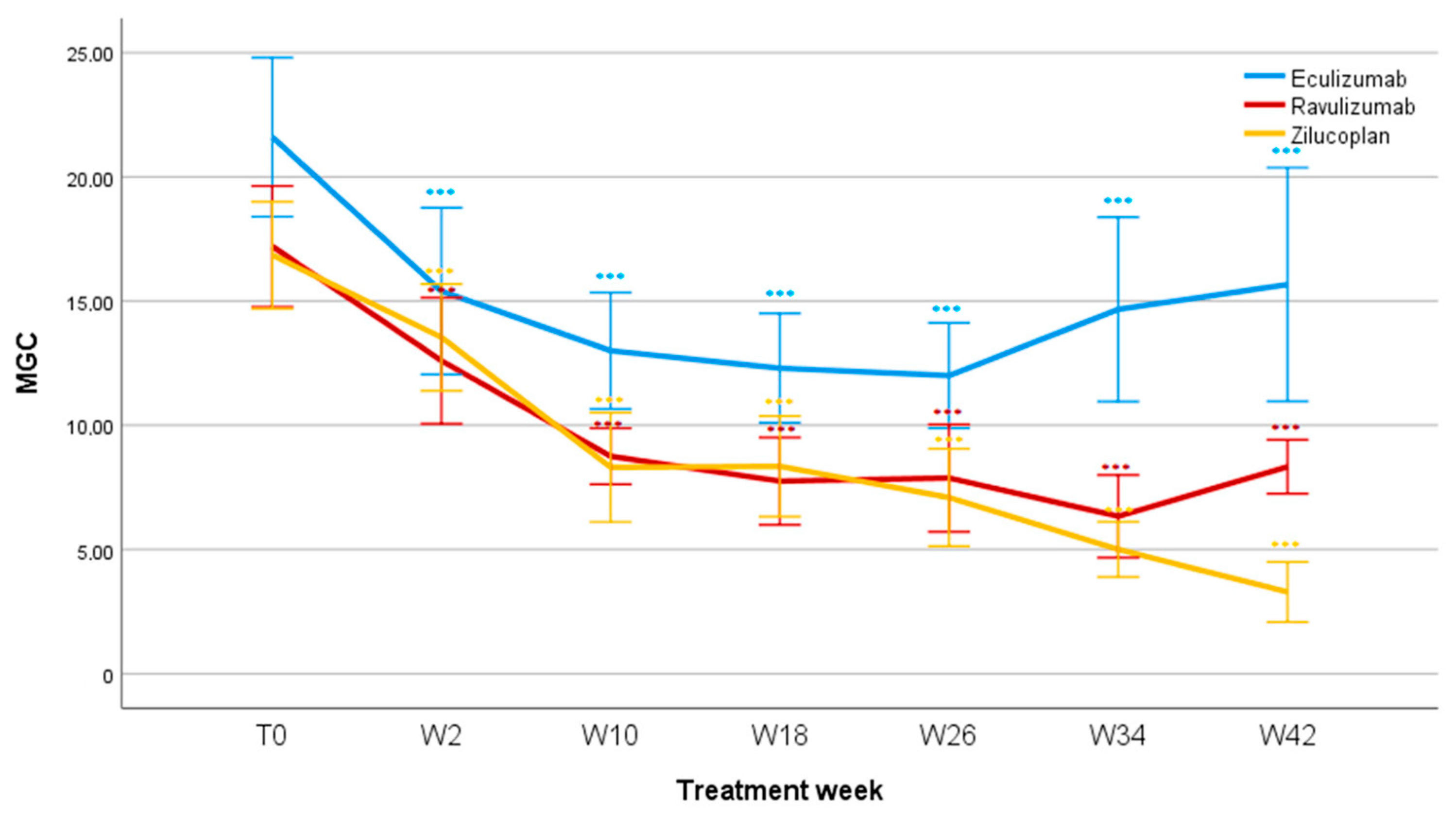 The treatments significantly reduced the MGC score in the observed period (F = 9.466; p < 0.001). The reduction in the MGC was already significant at two weeks (F = 25.4; p < 0.001) and remained significant at 10 weeks (F = 45.6; p < 0.001), 18 weeks (F = 41.7; p < 0.001), 26 weeks (F = 37.6; p < 0.001), 34 weeks (F = 32.3; p < 0.001), and 42 weeks of treatment (F = 25; p < 0.001). Mean MGC values reduced for Eculizumab from 21.6 ± 7.2 (T0) to 15.7 ± 8.1 (W42); for Ravulizumab from 17 ± 7.7 (T0) to 8.3 ± 2.7 (W42); and for Zilucoplan from 16.8 ± 7.8 (T0) to 3.3 ± 3.2 (W42). No statistically significant differences were found between groups of patients treated with different therapies (F = 1.644; p = 0.213, Figure 3).