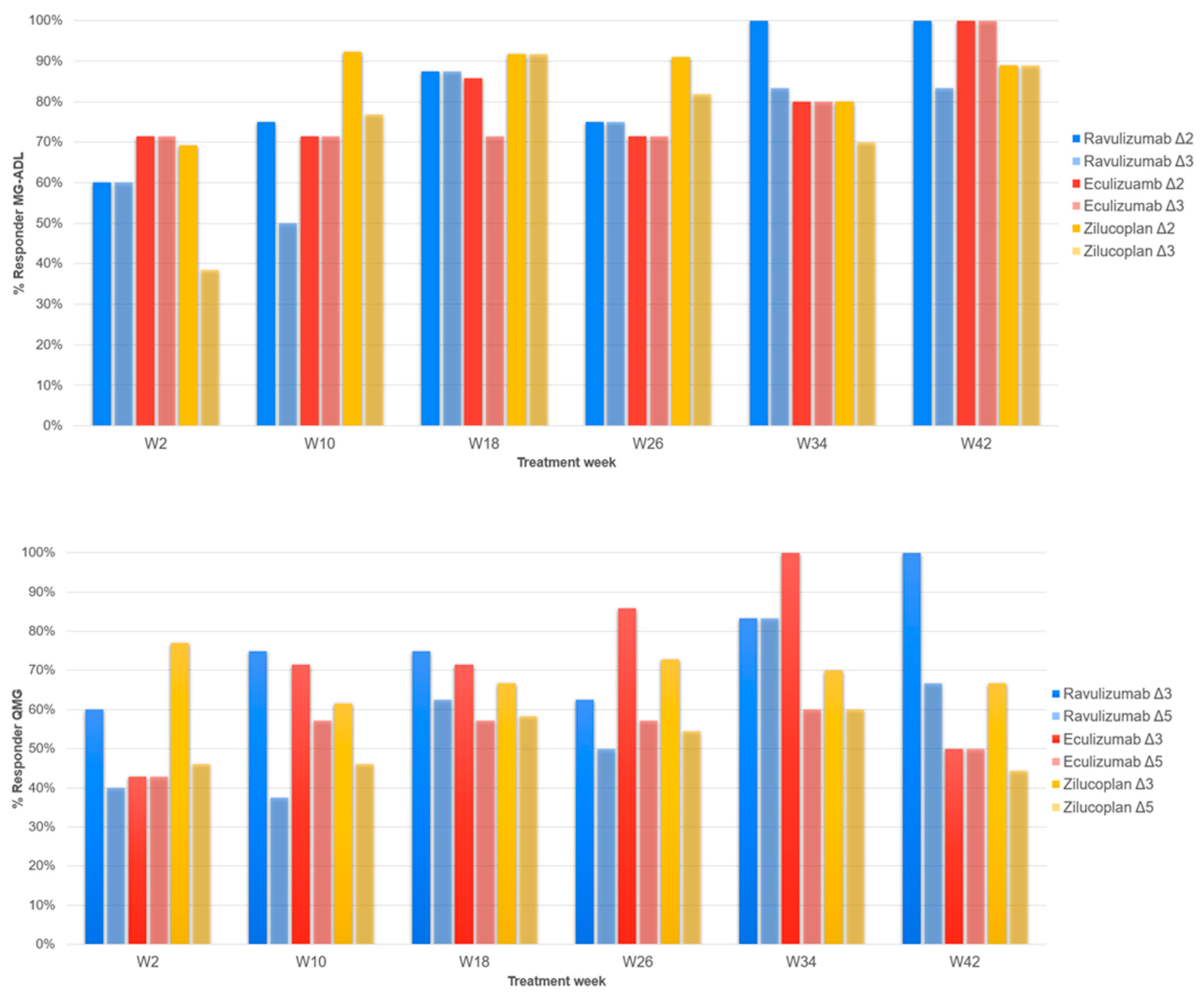Comparing MGC scores among therapies, a progressive decrease in the score is seen up to week 26, associated with a progressive clinical improvement, which continues at week 34 for Ravulizumab and up to week 42 for Zilucoplan. The group treated with Eculizumab saw an increase in the mean MGC from week 26 to week 34, a finding likely related to the small number of patients for that specific follow-up. For Ravulizumab and Zilucoplan, the largest variation occurs between week 2 and week 10; the former reaches its nadir at week 34 and the latter at week 42. For the group treated with Eculizumab, the largest variation in the mean MGC score occurs in the first two weeks, reaching its nadir at week 26. It is noteworthy that, since the T0, the MGC scores for Eculizumab have consistently been higher than those found for the other two groups; this may be related to a greater clinical impairment in these patients compared to those in the Ravulizumab and Zilucoplan patients. Figure 4 shows the responder rates of the MG-ADL and QMG, respectively.